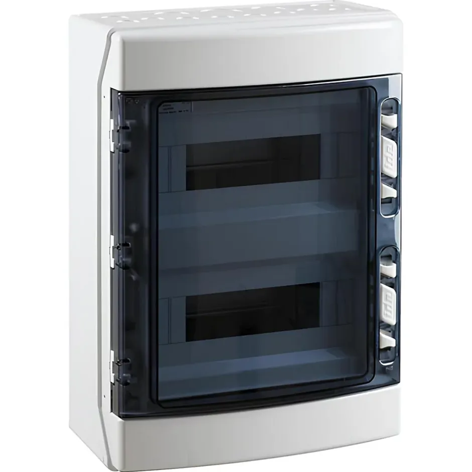 Coffret électrique étanches 24 modulesLe coffret CDN24PT fabriqué par IDE appartient à la gamme ECOLOGY. Cette gamme de coffret garantie une étanchéité IP65 permettant l’installation du coffret en extérieur.Sa porte transparente en polycarbonate permet d’apporter une grande robustesse au coffret. il dispose d’un indice de résistance aux chocs IK08.Ce coffret modulaire étanche permet d’intégrer 24 modules répartis sur 2 rangées.Bornier de terre à commander séparément ref 22003Ce coffret dispose d’une tenue au fil incandescent de 650°C2 Rails DIN permettant l’ajout de 12 modules de 18mmPorte transparente en polycarbonate2 serrures avec système de fermeture à pression. Serrure a clé ref 92150 disponible en optionEntrées de câbles pré découpéesDimensions : 436x310x148mmEntraxe inter rail DIN : 150mmLes plus du coffret CDN24PT – IDE ECOLOGYRésiste aux UVPeut être jumelé avec un coffret de la gamme STARLa gamme ECOLOGY propose des coffrets de 4 à 54 modules