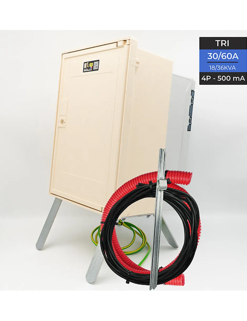 Coffret triphasé 30/60 Ampères 18/36KwsCoffret complet et conforme aux NF-C 14-100/ 15-100 .Caractéristiques techniques : – enveloppe coffret NH 62-S-20 – coffret coupe circuit tétrapolaire 60 Amp taille 00 plombable – disjoncteur d’abonné différentiel AGCP 4P 30/60 500mA plombable NF-C 62-411 – interrupteur différentiel haute sensibilité 4P 63 Ampères 30 mA – boitier IP2X pour interrupteur différentiel – câblage en fil cuivre souple de section 16² avec embouts sertis – emplacement pour fixation du compteur (compteur fourni par le fournisseur d’ énergie) – tension de 400 Volts – puissance maxi 60 ampères 36000 watts – 4 prises 16A P+N+T standard domestique – 1 prise 16A 3P+N+T standard CE – 1 prise 32A 3P+N+T standard CE – 2 disjoncteurs P/N 16A courbe C 4.5kA – 1 disjoncteur 4P 16A courbe C 4.5kA – 1 disjoncteur 4P 32A courbe C 4.5kA – 1 piquet de terre d’un mètre – câble de terre d 2 mètres – 3 mètres de câble 4×25² pour le raccordement au réseau – piétement acier galvanisé 3mm – gaine TPC 2 mètres – garantie de 2 ans En option , arrêt d’urgence et longueur de câble réseau supplémentairelivraison gratuite sous 24 à 48 heures en point relais par UPS si commande avant 15 heures – coffret electrique de chantier Coffret de chantier triphasé avec 4 prises mono 16A et 2 prises tri 32A et 16A. Coffret de chantier triphasé 18/36 Kws équipé de 7 prises : Triphasé 18/36KW, coffret de chantier triphasé 6 prises. Coffret de chantier triphasé complet avec distribution sur 6 prises
