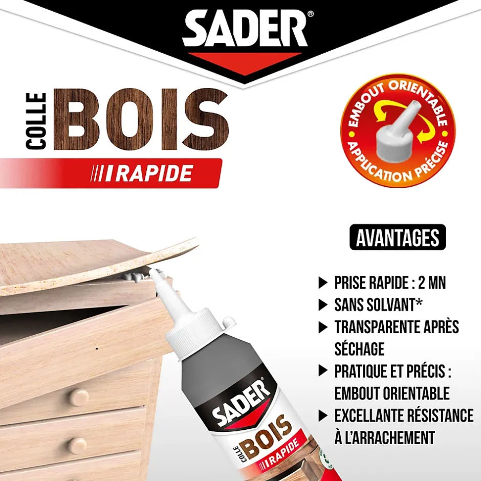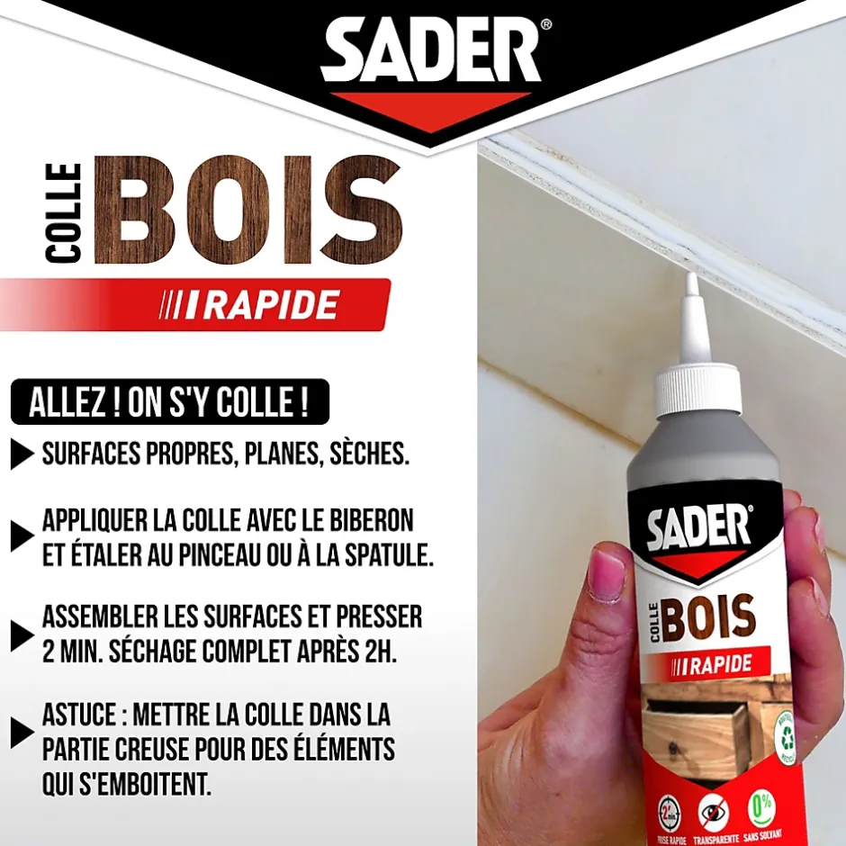 Colle à bois à prise rapide Sader transparente après séchage biberon de 250 g