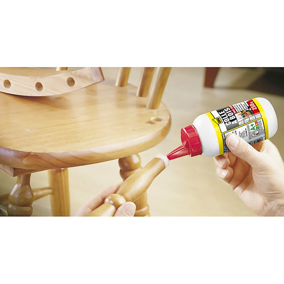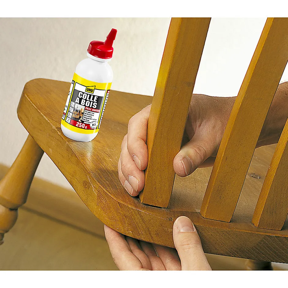 UHU Colle à bois originale prise rapide est une colle vinylique plus forte que le bois, elle résiste à l’humidité, s’utilise en intérieur (D2), sèche très rapidement, transparente après séchage, peut être peinte.S’utilise pour les collage de bois sur bois, panneaux de fibres de bois souples et rigides, panneaux de résine synthétique et panneaux d’aggloméré sur bois. Elle est excellente pour le placage/collage de papier, carton, constructions en bois comme les châssis de fenêtre et les portes. Convient en particulier aux encollages qui exigent une grande résistance à l’humidité.Mode d’emploi:Les surfaces à coller doivent être propres, sèches,dégraissées et exemptes de poussière.1: Appliquer une fine couche de colle uniforme sur une seule ou les deux faces à l ‘aide d’un peigne d’encollage à denture fine (1mm) ou d’une brosse.2: Laisser absorber quelques minutes.3: Assembler les deux parties dans les 8 minutes et serrer ou presser pendant 5 min. La pression souhaitée est de 2-5 kg/cm².