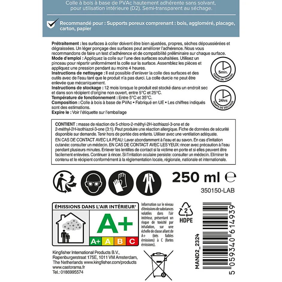 - Instructions d’utilisation : Appliquez la colle sur l’une des surfaces à coller. Utilisez une brosse pour répartir uniformément la colle sur la surface. Assemblez les pièces et laissez-les comprimées pendant au moins 30 minutes. Séchage complet en 24 heures.