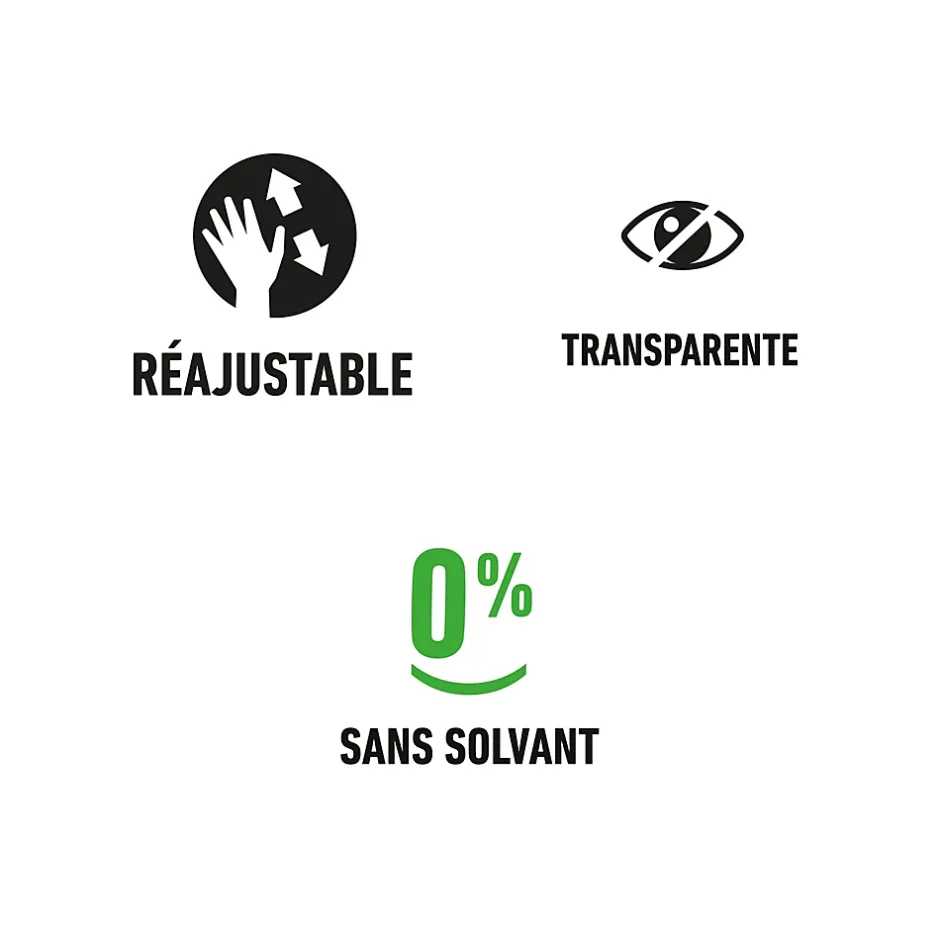 - Transparente après séchage, ne tache pas.