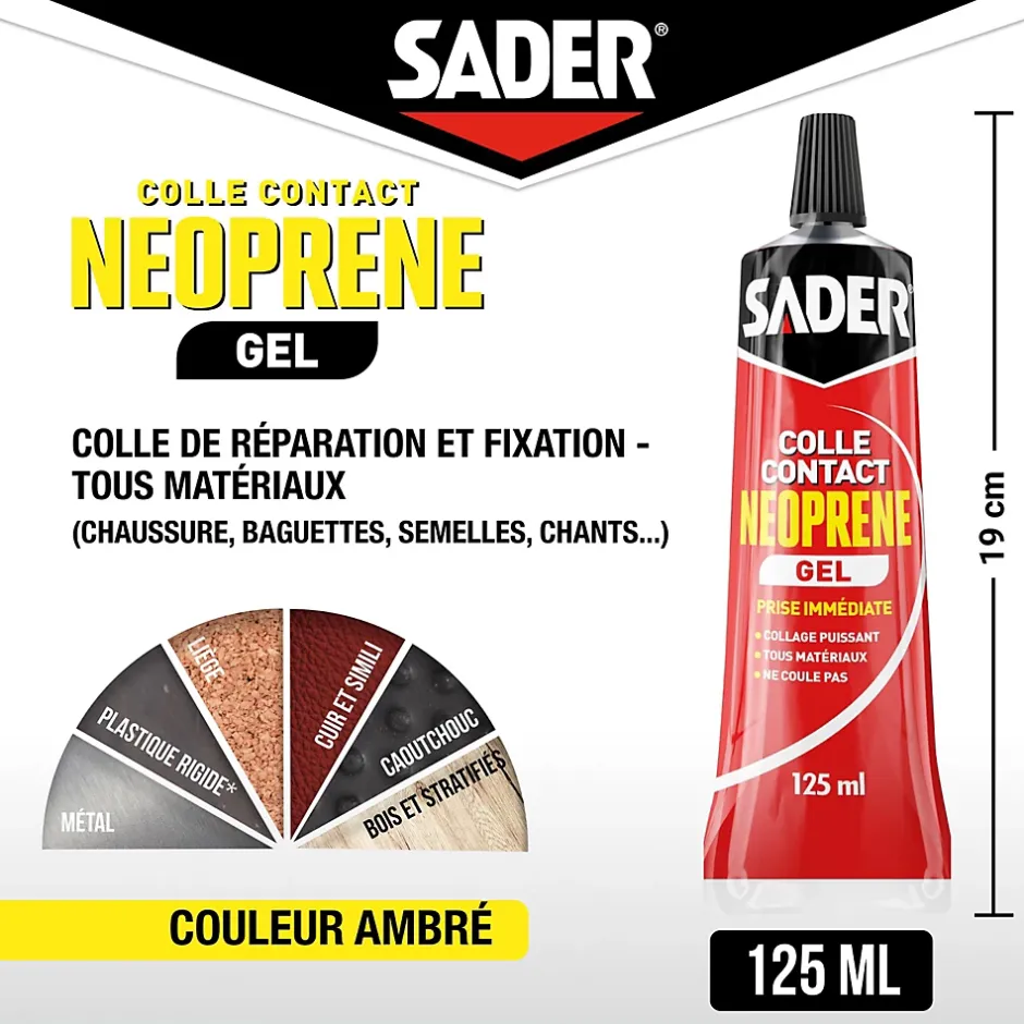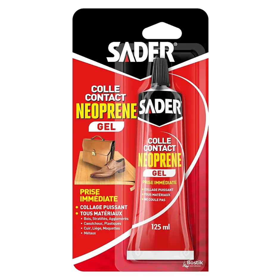 La Colle Contact Néoprène Gel de SADER est idéale pour l’assemblage et le placage de la plupart des matériaux sur tous supports en intérieur et extérieur sous abri : – Bois et Stratifiés : baguettes, placages sur bois et plans de travail, chants de table. – Caoutchouc : nez de marche, dalles de sol, semelles. – Cuir et Simili : chaussures, vêtements, bagages. – Liège : revêtements muraux, dalles. – Plastique rigide : gaines et plinthes électriques, revêtements de sols. – Métal : doublage de portes, habillage de tôles.