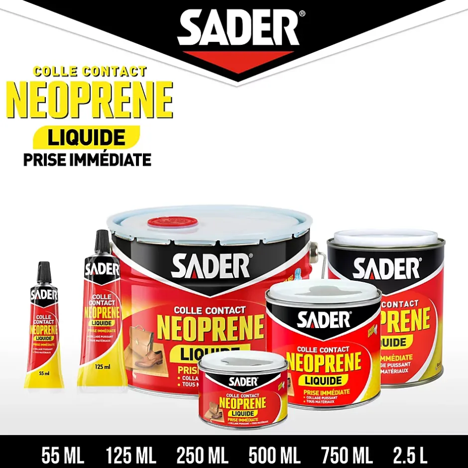 La Colle Contact Néoprène Liquide de SADER est idéale pour l’assemblage et le placage de la plupart des matériaux sur tous supports en intérieur et extérieur sous abri : – Bois et Stratifiés : baguettes, placages sur bois et plans de travail, chants de table. – Caoutchouc : nez de marche, dalles de sol, semelles. – Cuir et Simili : chaussures, vêtements, bagages. – Liège : revêtements muraux, dalles. – Plastique rigide : gaines et plinthes électriques, revêtements de sols. – Métal : doublage de portes, habillage de tôles.