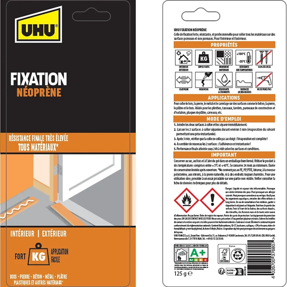 UHU fixation néoprène est extra forte & rapide – pour un résultat fiable, rapide, et facile ! Possibilité d’effectuer une multitude de travaux d’assemblage et de réparation sans trous, tout en garantissant efficacité et résistance. Idéale pour assembler toutes sortes de matériaux comme le bois, la pierre, le béton, le métal et adhère à pratiquement tous les supports en pierre, en béton, en bois, en métal, en matière synthétique, en plaque de plâtre, etc. S’utilise à l’intérieur comme à l’extérieur et convient à des matériaux sous tension. Convient très bien à la fixation de plinthes, de seuils, d’appuis de fenêtre, de plaques de construction, de lambris, de frises, de lattes, de chemins de câble, de numéros de maison, de panneaux de revêtement mural, de panneaux, de carrelages en céramique, de prises électriques et de boîtiers électriques. Mode d’emploi: Pour faciliter l’application, assurez-vous que les surfaces soient propres. Collage classique: 1: En fonction du poids du matériau, appliquez la colle uniformément en bandes verticales ou en plots à des intervalles de 20 à 40 cm. 2: Appliquez toujours de la colle dans les coins et le long des bords. 3: Assemblez les matériaux en exerçant une poussée et joignez-les en les pressant ou en les tapotant fermement. 4: Il est toujours possible de corriger. Collage puissant pour les matériaux lourds, sous tension ou non poreux: 1: Assemblez les matériaux, appuyez et relâchez/décollez immédiatement. 2: Laissez sécher pendant 5 minutes 3: Assemblez au même endroit et appuyez fermement ou tapotez. 4: Il n’est pas possible d’ajuster.