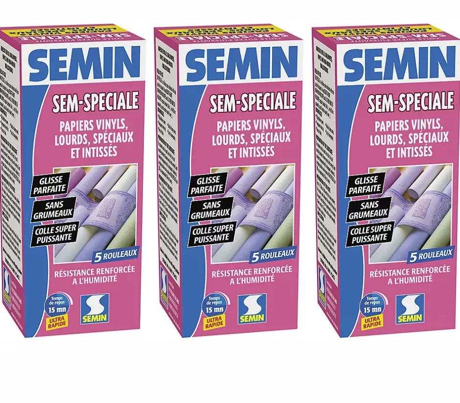 Ce pack contient :Sem-Spéciale, colle en poudre pour papiers peints vinyls et intissés, 3 boites de 200 gDESCRIPTION DU PRODUITColle cellulosique renforcée à la résine pour le collage des intissés à peindre ainsi que tous les papiers peints :Normaux (courants, épais…)Vinyls (plats ou expansés)Spéciaux (à peindre, lourds…)AVANTAGESCollant élevéTransparente après séchageNe tâche pasIdéale pour les pièces humidesGrande facilité d’homogénéisationColle adaptée à une utilisation en machine à encollerSUPPORTS ADMISPlaques de plâtre, carreaux de plâtre, béton ou enduit ciment, plâtre.COMPOSITION ET ASPECTLa colle SEM-SPECIALE se présente en poudre.CONDITIONNEMENTBoîte de 200 g.ACCESSOIRES COMPLÉMENTAIRESMachine à encoller si application mécanique.RENDEMENT200 g pour 5 rouleaux.