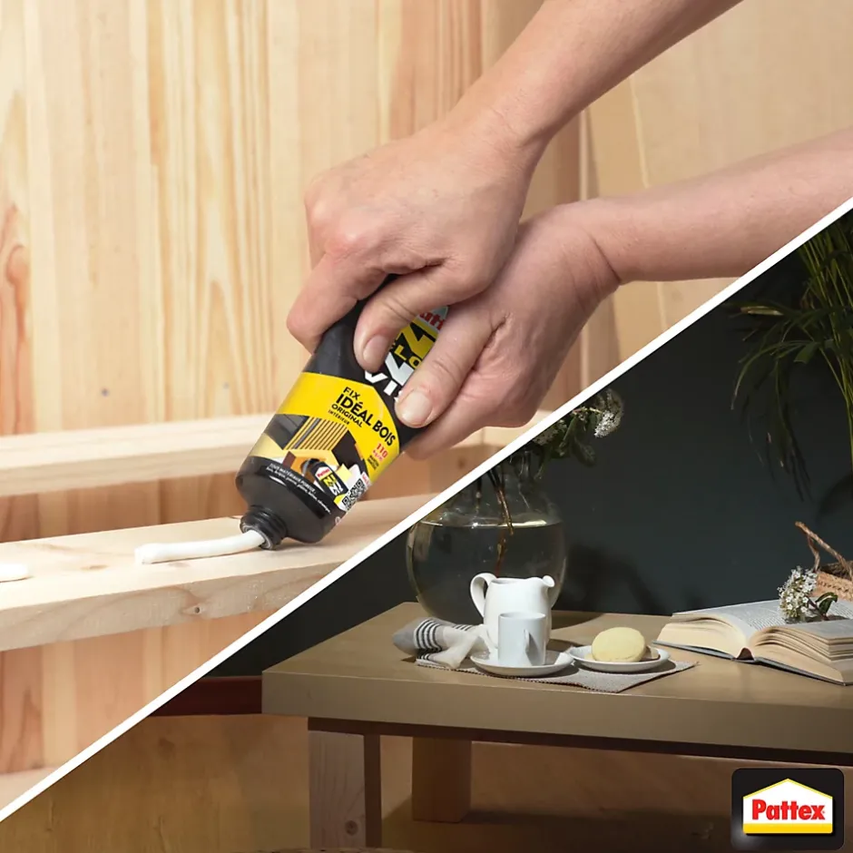 Pattex Colle de Fixation Ni Clou Ni Vis Fix Idéal Bois est une colle conçue pour un résultat fiable et rapide, sans percer. Pour des travaux en intérieur, pour un collage sur mur ou plafond, la colle de fixation Pattex Ni Clou Ni Vis Fix Idéal Bois vous assure une fixation puissante ! Cette colle sans solvant est idéale pour les matériaux poreux comme le bois, la brique, la pierre et le plâtre. Particulièrement efficace pour des applications en intérieur, elle assure un collage solide sur les matériaux lourds mais aussi sur les objets tels que les plinthes, patères, tasseaux, étagères, etc. Un des deux matériaux doit être poreux.