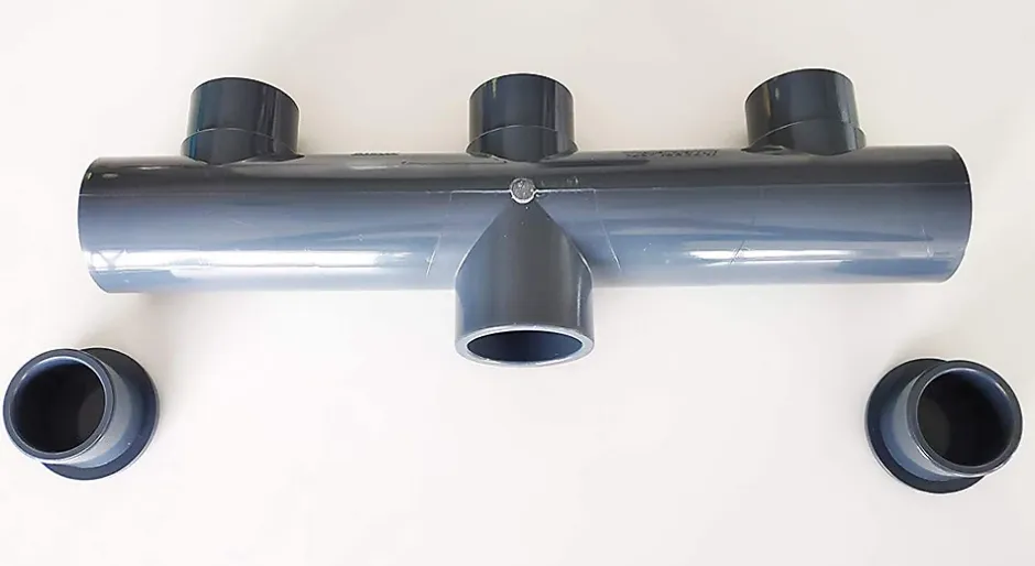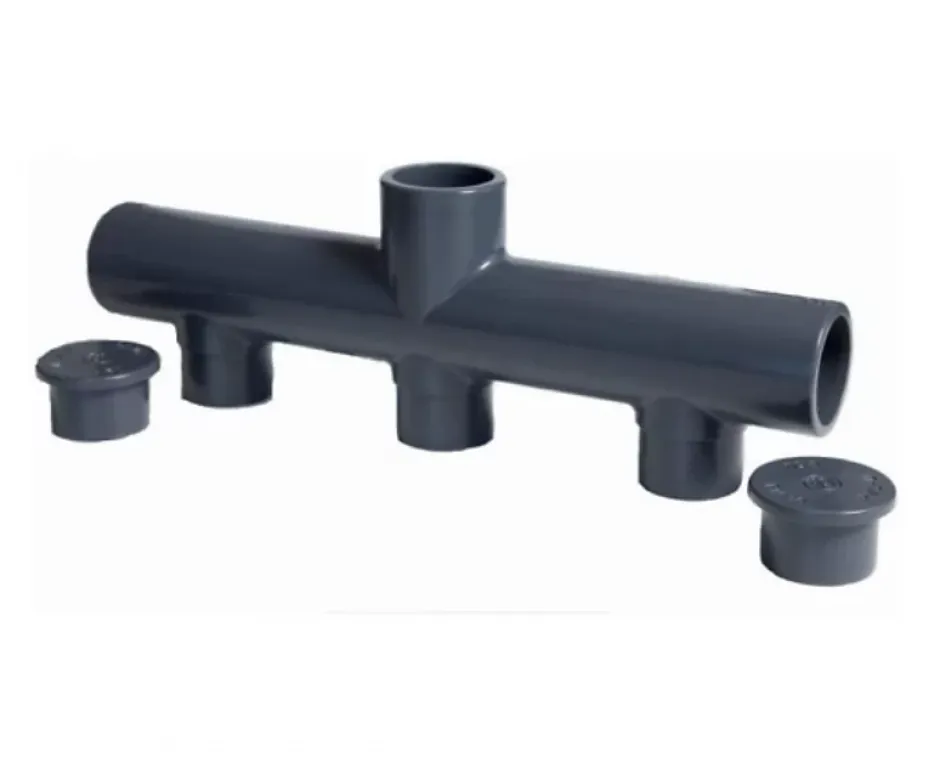 PVC pression à coller PN16 / Pression 16 bars.Collecteur avec deux bouchons de sortieLes collecteurs peuvent recevoir un coude ou un té supplémentaire pour augmenter le nombre d’aspirations