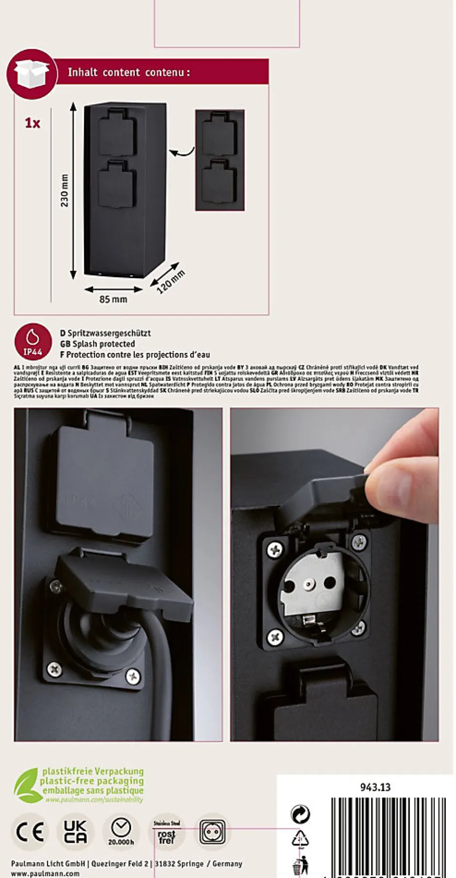 La colonne de prises Rio alimente l’espace extérieur en électricité. La protection anti-projections d’eau IP44 et les prises de terre en font un outil parfait pour alimenter en électricité l’éclairage de jardin. Les prises sont câblées en parallèle.