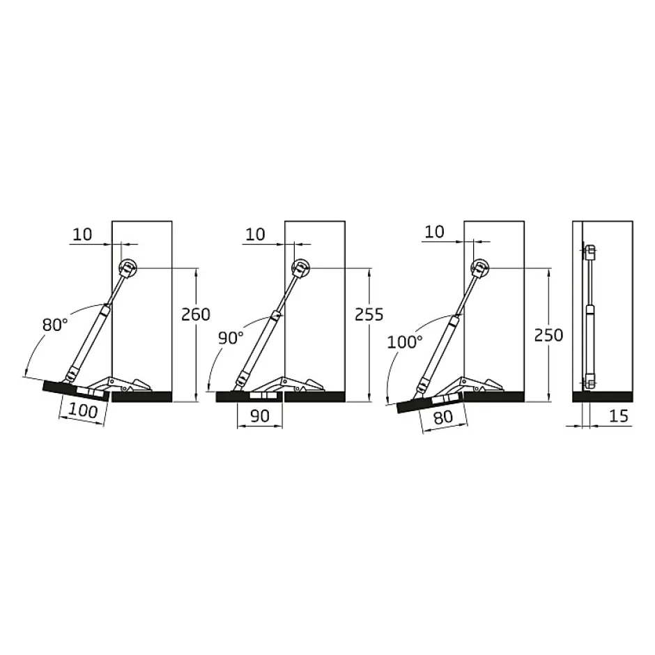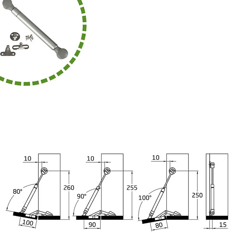 Compas à gaz fermé. Pour les portes battantes à ouverture descendant. Le vantail est positionné à 80°, 90° ou 100° en fonction de la taille et du poids. Inclus les supports de fixation pour le bois et l’aluminium. Compas à gaz pour portes battantes de meubles. Fabriqué en acier et en polypropylène gris aux extrémités. Avec fonction d’ouverture vers le bas. Le vantail est positionné à 80°, 90° ou 100° en fonction de la taille et du poids du vantail. Capacité de charge : 12 kg. Les supports de fixation pour le bois et l’aluminium sont inclus.
