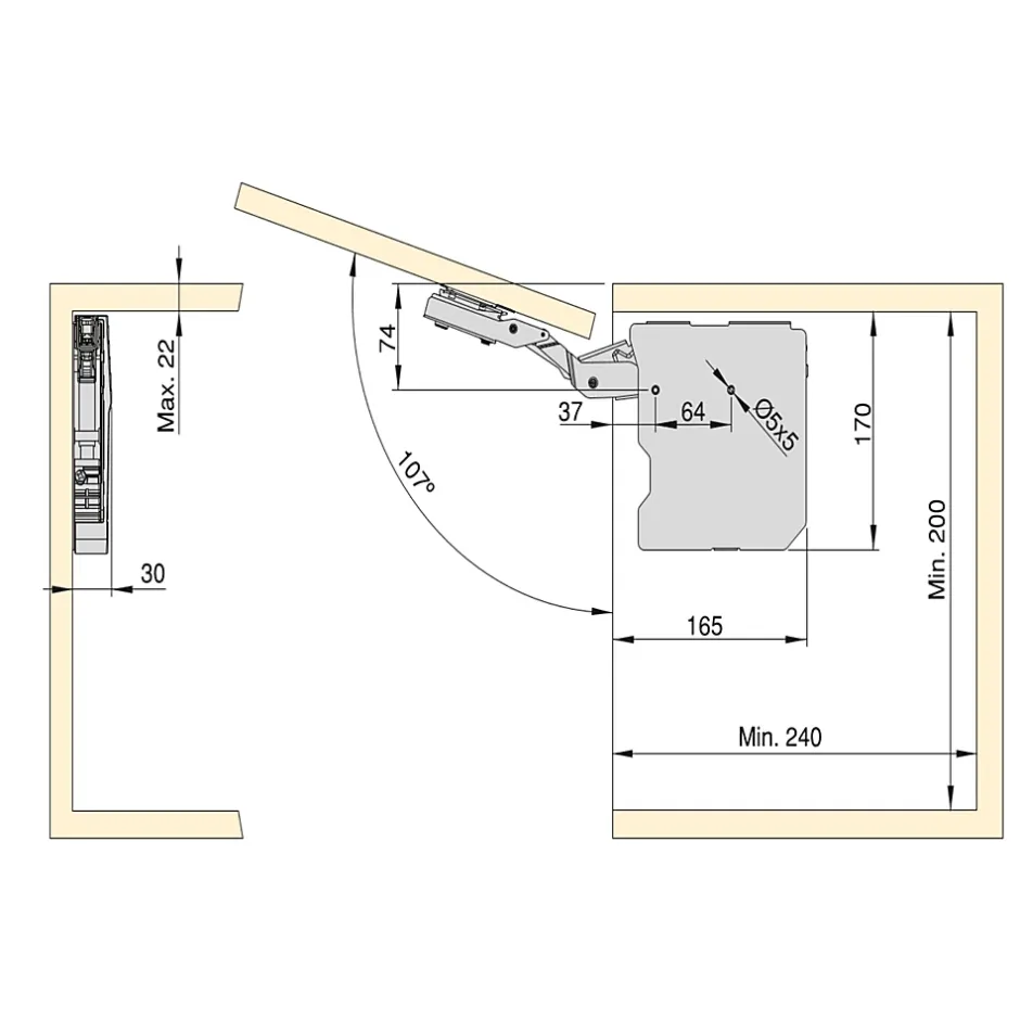 Système de compas pour portes relevables de meubles de cuisine et habitat, fonctionnement souple et précis sans charnières. Angle d’ouverture 107°, largeur caisson jusqu’à 1200 mm, hauteur 250-600 mm, épaisseur panneaux 16-22 mm. Comprend crochets, vis, cache, gabarit de marquage pour installation facile et précise.