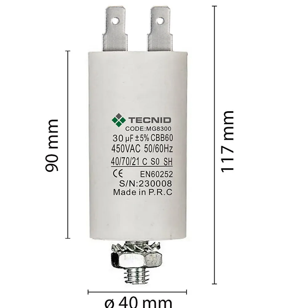 Capacité : 30 µF. Tension : 450 V~.Dimensions extérieures (diamètre x hauteur) : 40*95mm.Raccordement électrique via cosses faston 6,4 x 0,8 mm. Fixation mécanique par tige filetée et écrou M8.Tolérance de 5%. Durée de vie : 3000 heures. Température de fonctionnement -40°C~+70C.Le condensateur rond blanc est conçu pour un fonctionnement permanent. La principale application de ce type de condensateurs concerne les moteurs monophasés et peut également être utilisée dans les circuits de commutation, l’amortissement et les applications générales.