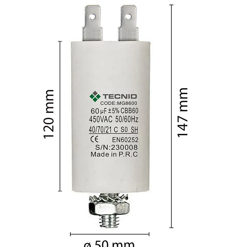 Capacité : 60µF. Tension : 450 V~.Dimensions extérieures (diamètre x hauteur) : 50*106 mm.Raccordement électrique via cosses faston 6,4 x 0,8 mm. Fixation mécanique par tige filetée et écrou M8.Tolérance de 5%. Durée de vie : 3000 heures. Température de fonctionnement -40°C~+70C.Le condensateur rond blanc est conçu pour un fonctionnement permanent. La principale application de ce type de condensateurs concerne les moteurs monophasés et peut également être utilisée dans les circuits de commutation, l’amortissement et les applications générales.