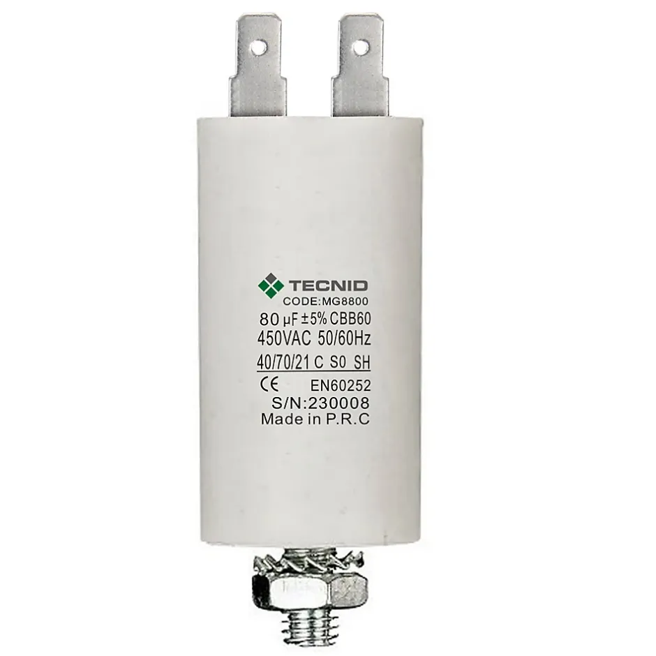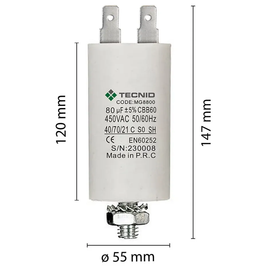 Capacité : 80 µF. Tension : 450 V~.Dimensions extérieures (diamètre x hauteur) : 55*120mm.Raccordement électrique via cosses faston 6,4 x 0,8 mm. Fixation mécanique par tige filetée et écrou M8.Tolérance de 5%. Durée de vie : 3000 heures. Température de fonctionnement -40°C~+70C.Le condensateur rond blanc est conçu pour un fonctionnement permanent. La principale application de ce type de condensateurs concerne les moteurs monophasés et peut également être utilisée dans les circuits de commutation, l’amortissement et les applications générales.