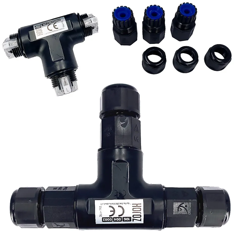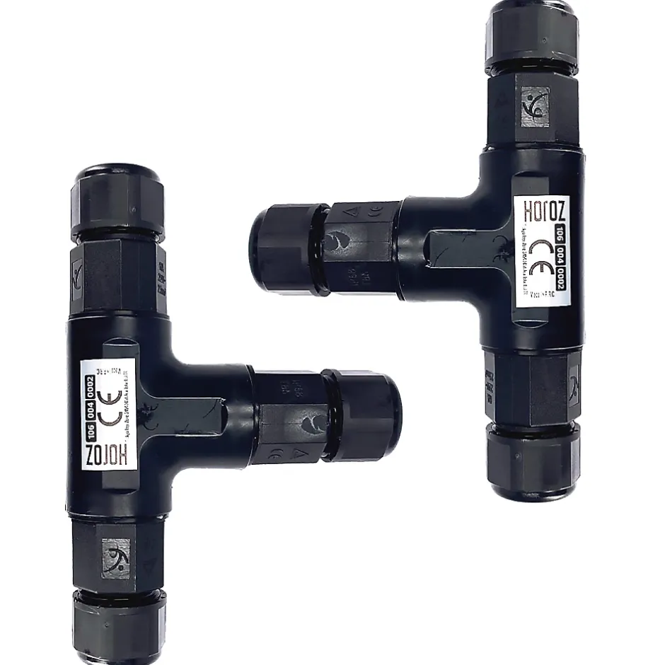 Connecteur de câble étanche en T, IP68, 0.5-2.5mm², 16A, 250V | HOROZ | 106-004-0002Le connecteur de câble étanche HOROZ ELECTRIC est une solution fiable et robuste, conçue pour raccorder des câbles électriques dans des environnements exposés à l’humidité, à la poussière et à d’autres conditions extérieures. Grâce à son indice de protection IP68, il assure une étanchéité totale contre l’eau et la poussière, ce qui en fait un choix idéal pour les applications extérieures et industrielles.Le système de connexion sans vis (connexion rapide) permet une installation simple et rapide sans outils. Il suffit d’insérer les câbles d’une section de 0,5 à 2,5 mm² pour obtenir une connexion électrique sûre et durable.Données techniques :✔️Code produit : 106-004-0002✔️Couleur : Noir✔️Indice de protection : IP68✔️Diamètre du câble : 6,5-11 mm✔️Nombre de pôles : 1-2✔️Section des conducteurs : 0,5-2,5 mm²✔️Courant nominal (max.) : 16 A✔️Tension nominale : 250 V✔️Dimensions : Hauteur : 91,4 mm / Largeur : 137,7 mm