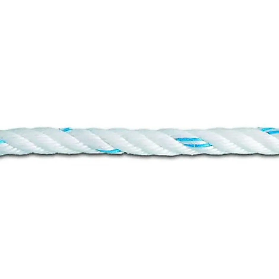 Corde polypropylène 20mm Blanche fil bleu au mètre. Polypropylène – Résistance à la rupture 5 691kg.