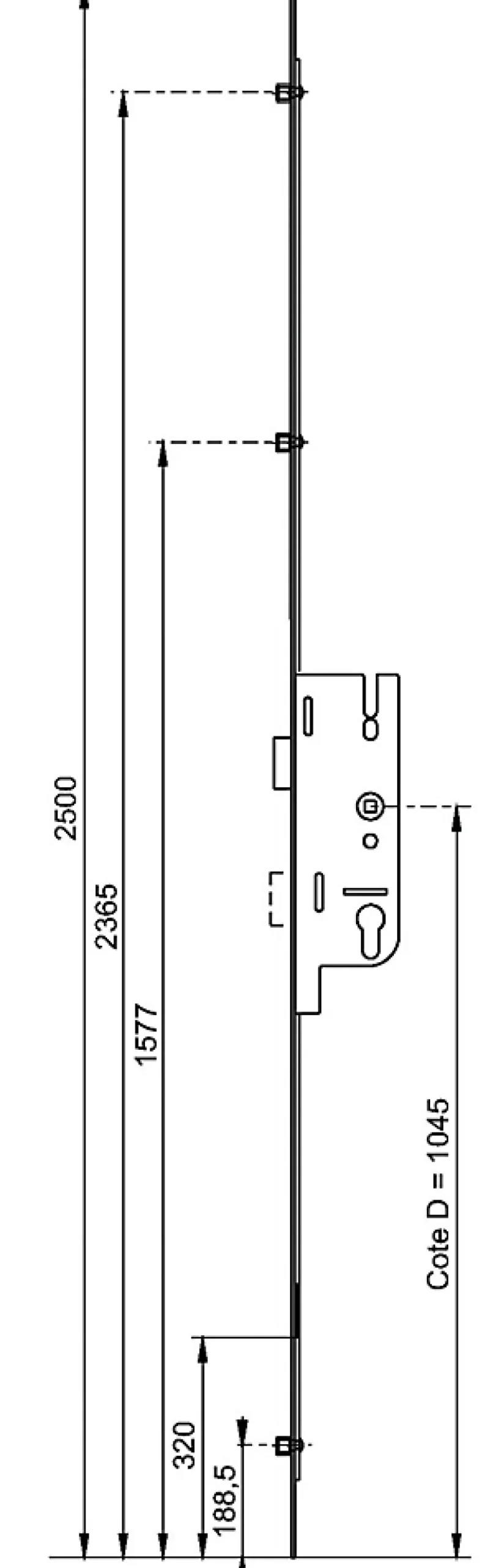 La crémone à larder EUROPA à galets pour porte cintrée est une solution de verrouillage innovante, spécialement conçue pour les portes cintrées. Sa conception élégante et fonctionnelle permet une intégration harmonieuse et une protection efficace sur les grandes surfaces de porte. Dotée de plusieurs galets robustes, cette crémone assure un verrouillage solide et fiable, offrant une sécurité accrue pour tout type d’habitat ou de local professionnel. Sa spécificité pour les portes cintrées en fait un choix idéal pour ceux qui cherchent à combiner esthétique et sécurité, sans compromis sur l’une ou l’autre.En termes d’installation et de compatibilité, la crémone à larder EUROPA se distingue par sa facilité de mise en place et sa polyvalence. Avec une têtière adaptée et un entraxe standard, elle convient à une grande variété de configurations de portes. Elle comprend un système de pêne demi-tour et de pêne dormant, garantissant une double sécurité. Ce mécanisme, combiné avec les galets, crée un verrouillage robuste et fiable, idéal pour ceux qui privilégient une sécurité renforcée tout en souhaitant préserver l’esthétique de leurs portes. Ainsi, la crémone à larder EUROPA à galets pour porte cintrée de Ferco représente une excellente option pour allier haute sécurité et design élégant. Caractéristiques techniques :Nombre de galets : 3Position du verrouillage 1 haut (A1) : 521 mmPosition du verrouillage 2 haut (A2) : 1309 mmPosition du verrouillage 1 bas (B1) : 867,5 mmCôte D : 1045 mmEntraxe : 70 mmTêtière : 18 mmLongueur 2500 mm