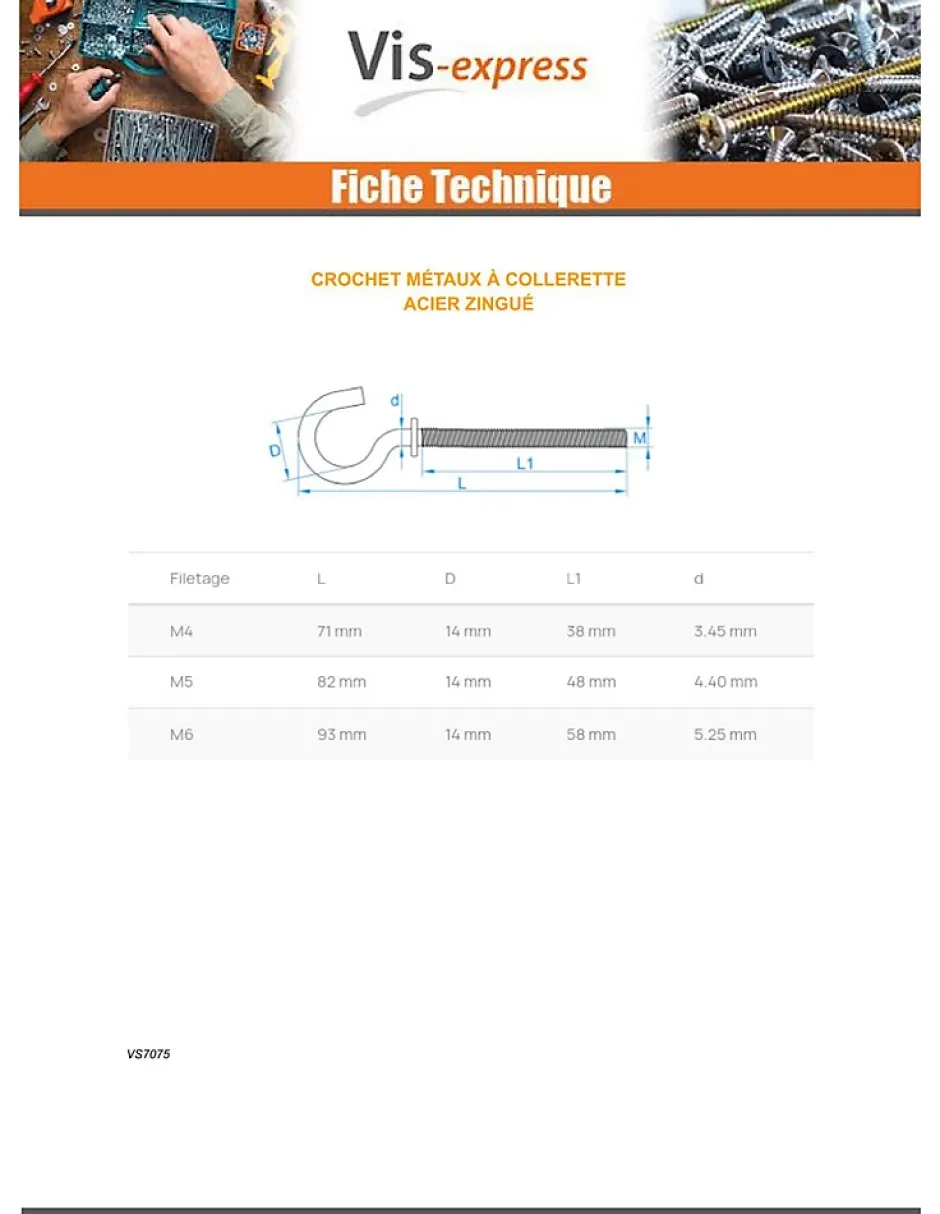 Crochet Métaux à collerette M5X50 Acier zinguéDiametre = M5, Longueur = 50, Revetement De Surface = Zingue Blanc, Matiere = Acier, Famille De Produits = PitonnerieAutre références : 016.00550.102 3663072124875