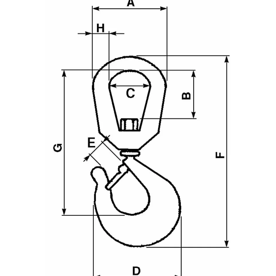 Crochet tournant avec sécurité 2000KA mm 76B mm 40C mm 45D mm 104E mm 28F mm 206G mm 162H mm 15.9Force kg : 2000Matériau : acier carbone C40