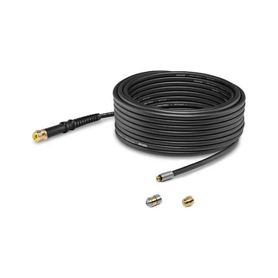 Ce kit débouche canalisations de 15 m est idéal pour l’entretien des conduites et l’élimination des bouchons. Il comprend deux buses : une buse 360° pour l’entretien préventif et une buse classique pour déboucher. Fabriqué avec un tuyau souple renforcé et un raccord en laiton, il assure durabilité et efficacité.