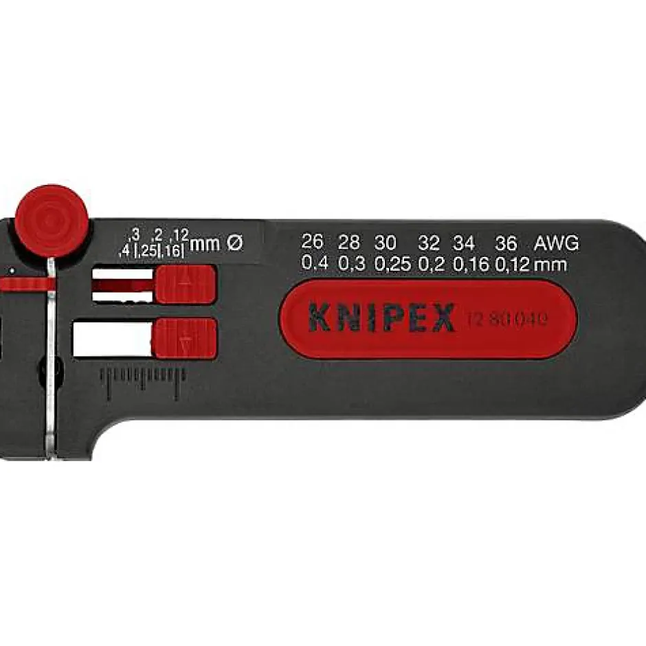 Outil à dénuder petit modèle Knipex 12 80 040, longueur 100 mm, poids 52 g. Conçu pour conducteurs fins en cuivre d’un diamètre de 0,12 à 0,4 mm (AWG 26–36). Équipé d’une butée longitudinale réglable de 4,0 à 15,0 mm pour des longueurs de dénudage répétables, d’un coupe-fils intégré et d’un système de verrouillage. Réglage progressif pour un dénudage précis adapté au diamètre du conducteur, idéal pour travaux d’électronique et câblage fin. Garantie fabricant 2 ans.