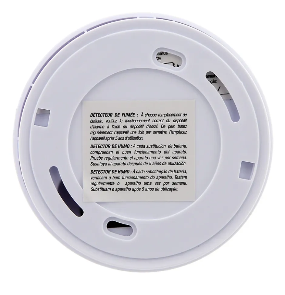 Détecteur de fumée. Autonomie des piles : 5 ans. Chevilles et vis de montage incluses. Dimensions : Ø 7 x 3.5 cm. Garantie : 5 ans. Norme(s) : CE