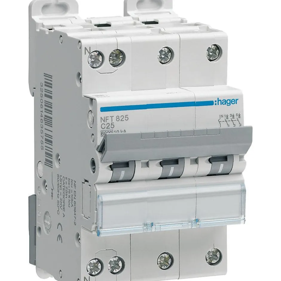 Ce disjoncteur Hager fait partie de la gamme NFT qui permet d’associer différents disjoncteurs 1P+N, 3P et 3P+N sous une même barre de pontage. Nombre de pôles : 3 pôlesCourant assigné nominal : 40 APouvoir de coupure : 6-10 kA