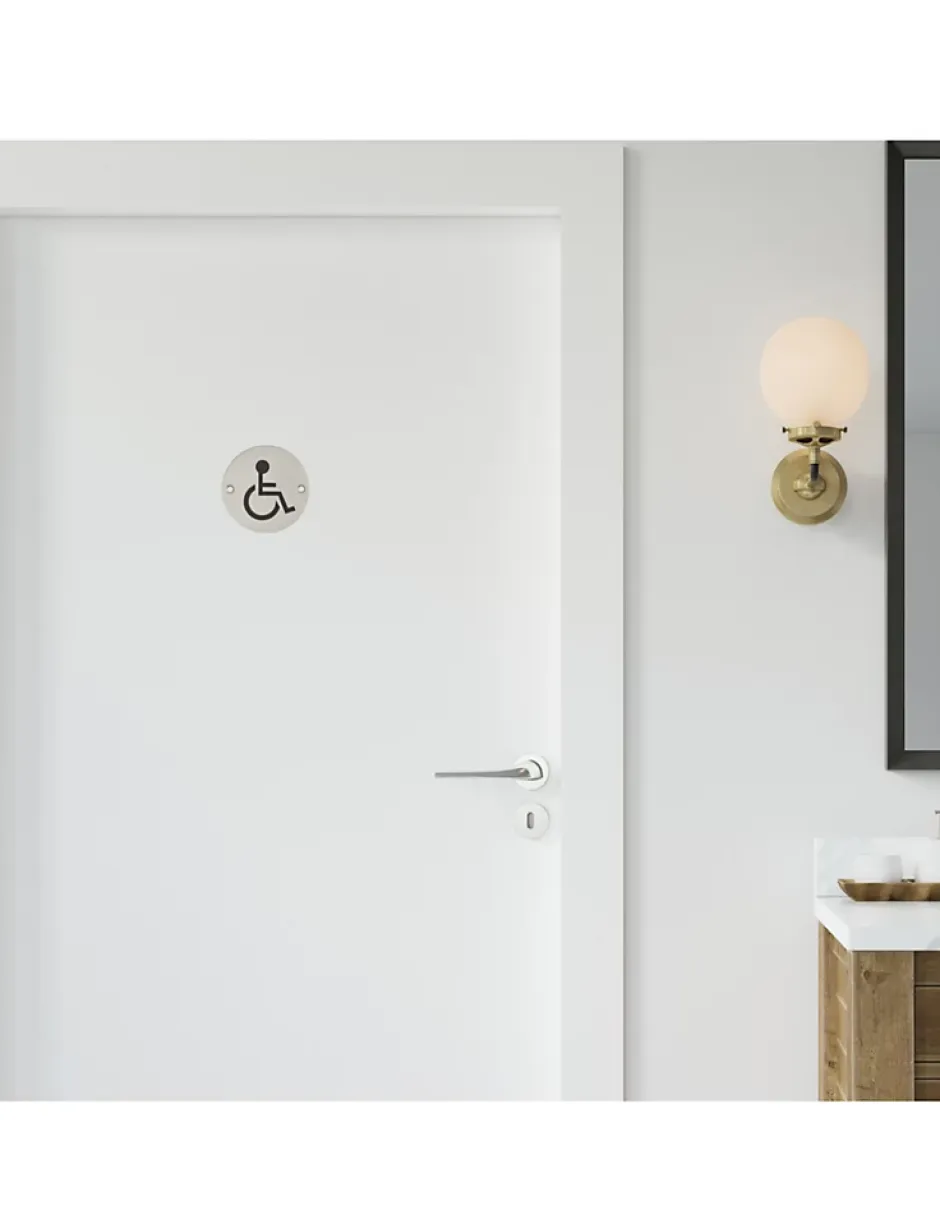 Complétez la signalisation de votre établissement avec notre signalétique de porte pour toilettes handicapés. Conçue pour allier simplicité et style, cette plaque de signalisation est idéale pour les restaurants, bureaux, centres commerciaux et tout autre lieu public.Caractéristiques :Matériaux en acier inoxydable : Fabriquée en acier inoxydable durable, cette plaque est conçue pour résister aux chocs et aux conditions d’utilisation quotidienne.Design clair : Icône universelle avec un marquage noir pour une visibilité optimale. Installation facile : S’installe en quelques minutes sur toute surface lisse à l’aide de deux vis. Dimensions appropriées : Taille parfaite pour être visible de loin, sans encombrer l’espace.Avantages :Contribue à rendre votre espace plus inclusif et accueillant.Idéal pour les restaurants, bureaux, centres commerciaux, et lieux publics.Respecte les normes d’accessibilité en vigueur.
