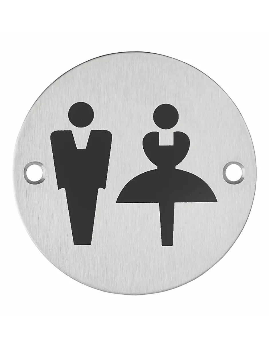Disque signalétique diamètre 76mm WC Homme/Femme à visser. En acier inoxydable 304, marquage noir, finition brossée.
