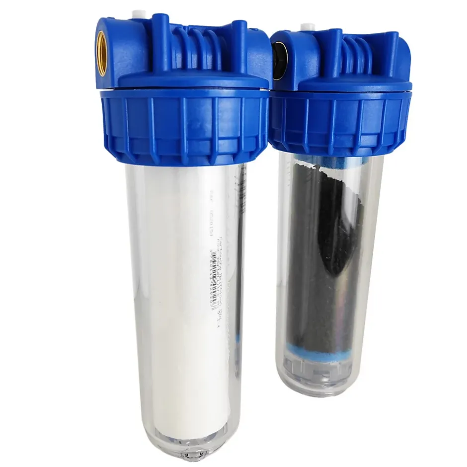Double Porte-filtre pour cartouches filtrantes 9″3/4.L’ensemble est composé de 6 pièces avec deux bagues de serrage tournantes qui assurent une étanchéité optimale entre les bols transparents et les têtes.Ce porte filtre double 9″3/4 est idéal pour traiter les impuretés, sédiments, chlore, mauvais goût ou odeurs désagréables présents dans l’eau. (Toutes les cartouches compatibles sont disponibles sur notre boutique.)Ce filtre double est particulièrement utile pour faire de la filtration sur de l’eau potable destinée à la boisson, avant un purificateur d’eau sous évier de cuisine ou même en amont d’une fontaine à eau.Compatible avec les cartouches de filtre à sédiment 9 pouces 3/4 allant de 1µm à 100µm.Contenu du kit de double porte-filtre 9″3/4 AF52001 insert laiton 26/34Le porte filtre double complet (bols + têtes)1 cartouche sédiments 20µm.1 cartouche de charbon actif.1 Clé de montage / démontage.1 équerre de fixation.4 vis2 mamelons laiton Mâle – Mâle 26/34 (1″).
