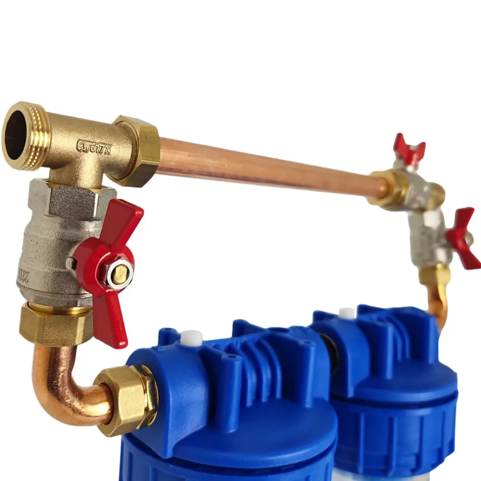 Double Porte-filtre avec bypass laiton pour cartouches filtrantes 9″3/4. L’ensemble est composé de 10 pièces avec deux bagues de serrage tournantes qui assurent une étanchéité optimale entre les bols transparents et les têtes, le bypass et trois vannes d’arrêt. Ce porte filtre double 9″3/4 avec bypass laiton est idéal pour traiter les impuretés, sédiments, chlore, mauvais goût ou odeurs désagréables et même le calcaire présents dans l’eau. (Toutes les cartouches compatibles sont disponibles sur notre boutique.) Ce filtre double est particulièrement utile pour faire de la filtration sur l’ensemble de votre réseau de tuyau d’eau de radiateurs ou en amont de votre adoucisseur d’eau ou avec un filtre sous évier pour rendre l’eau encore plus claire. Compatible avec les cartouches de filtre à sédiment 9 pouces 3/4 allant de 1µm à 100µm.Contenu du kit de double porte-filtre 9″3/4 AF5000BP bypass laiton 20/27Le porte filtre double complet (bols + têtes)1 bypass monté.1 Clé de montage / démontage.1 équerre de fixation.4 vis