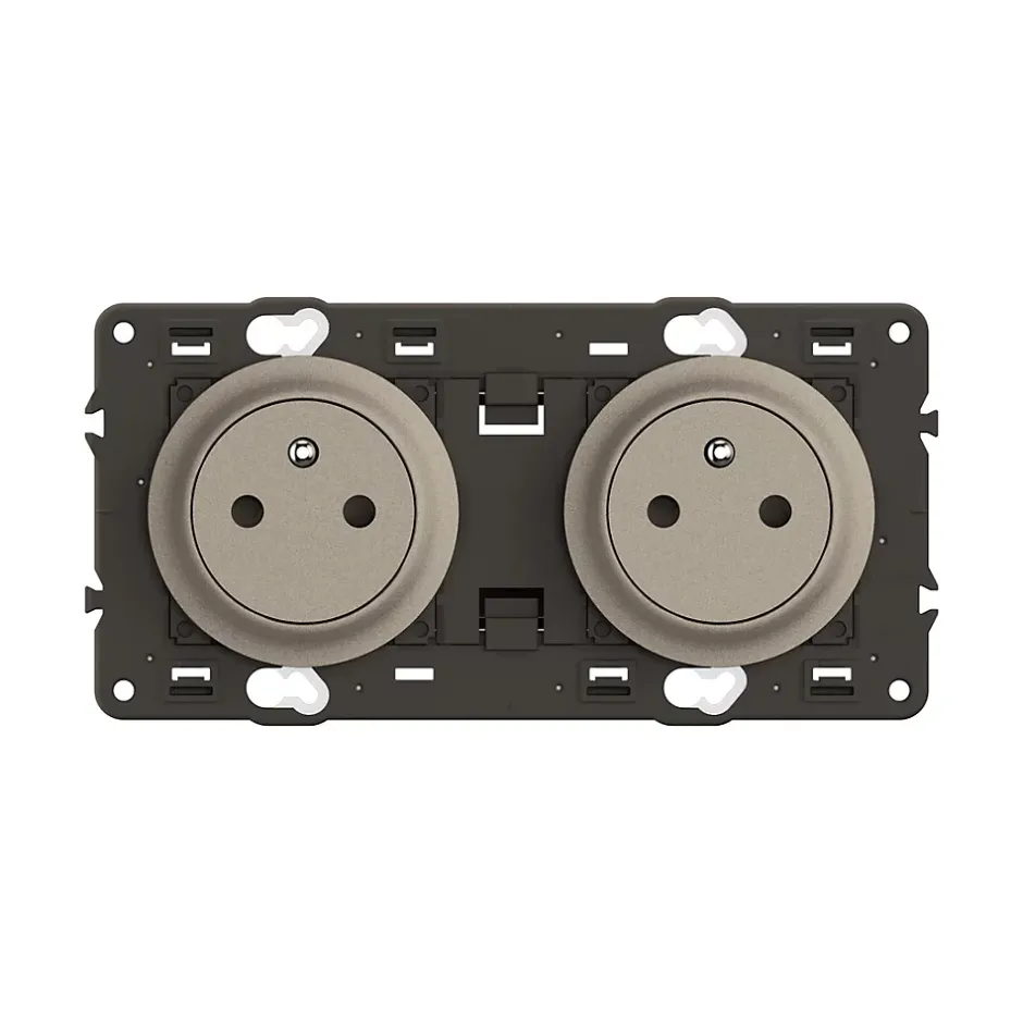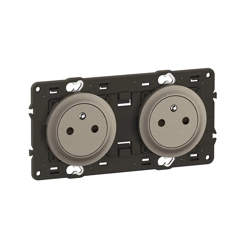 Double prise 2P+T précâblée Surface Confort Céliane – livrée avec enjoliveurs Titanium et support montés, à équiper d’une plaque de finition 2 postes