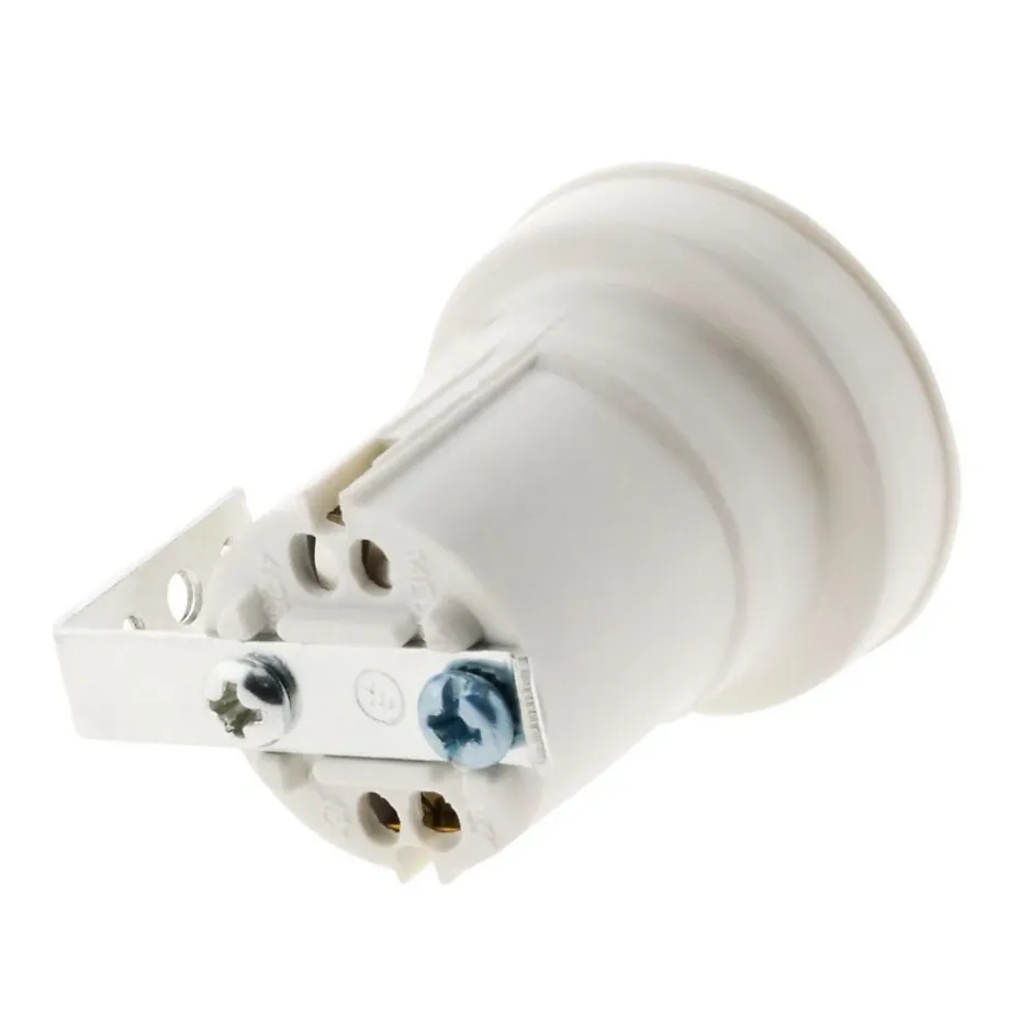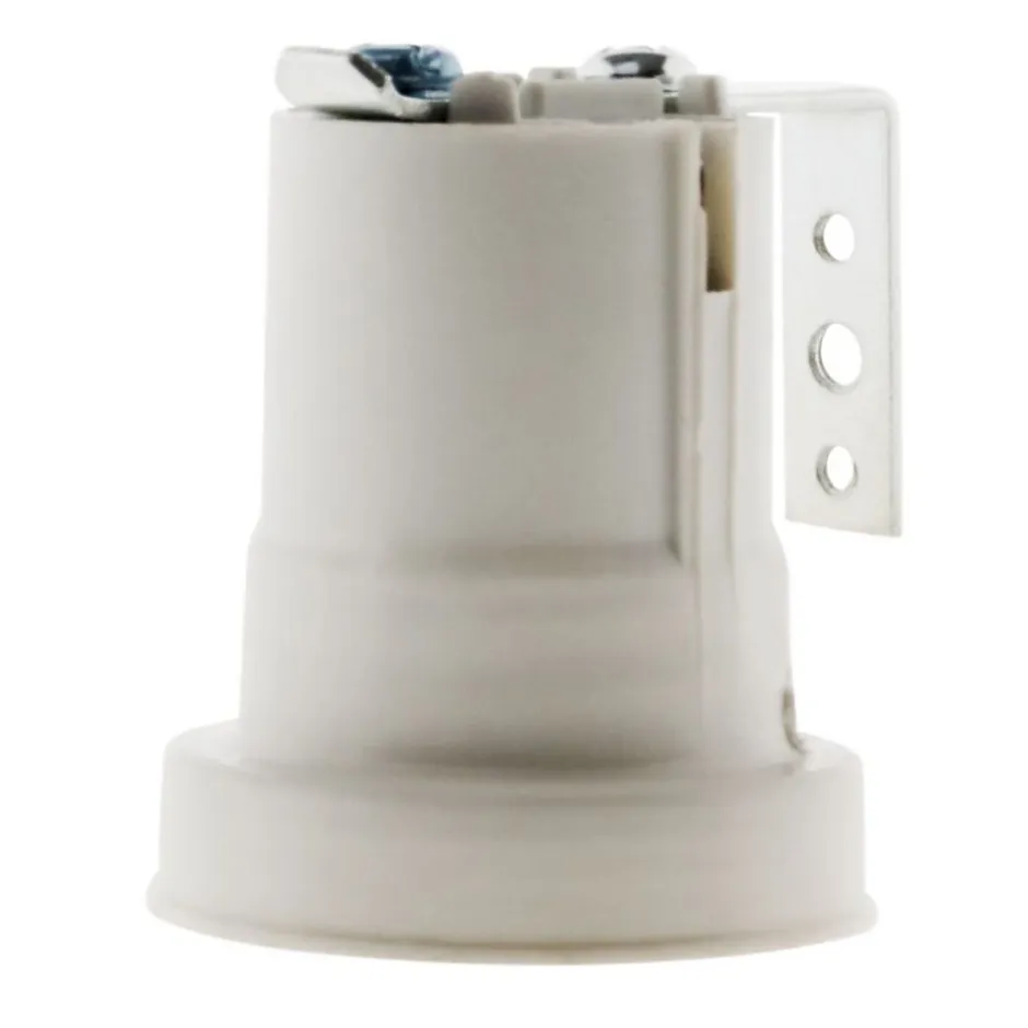 Douille E27 en résine de synthèse sans bague pour montage sur votre luminaire avec fixation par étrier, également appelé équerre. Fonctionne en 4A – 250V~ Douille E27 Résine avec patte équerre