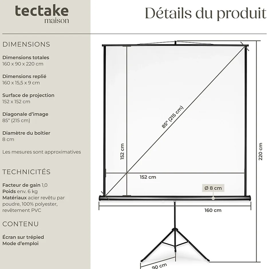 - Caractéristiques techniques:Zone de projection : 152 cm x 152 cm. Dimensions totales (LxlxH) : environ 160 cm x 90 cm x 220 cm. Dimensions de l’écran replié (LxlxH) : environ 18 cm x 8 cm x 220 cm. Diagonale d’image : environ 85 » ou 215 cm. Dimensions du boîtier (ØxL) : environ 8 cm Ø x 220 cm. Formats d’image : 1:1, 4:3, 16:9 et autres (selon le réglage de la longueur). Facteur de gain : environ 1,0. Matériaux : Boîtier et trépied en Acier revêtu. / Ecran en Tissu 100 % Polyester enduit de PVC. Poids : environ 6 kg.