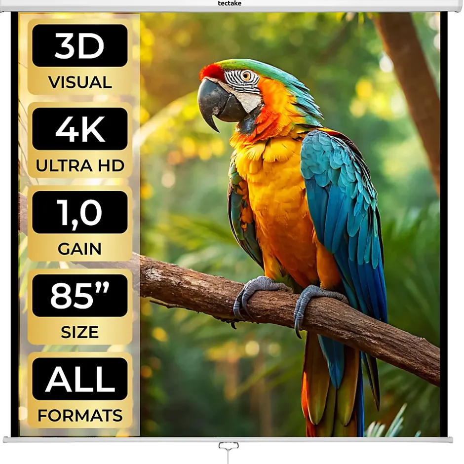 Écran de Projection, Écran de Vidéo Projecteur, Toile de Projection enroulable Blanc TECTAKE. Cette toile de projection vous apporte l’expérience ultime du cinéma à la maison. Installez-vous confortablement dans votre fauteuil ou votre canapé et regardez tous vos films, séries, documentaires sur grand écran avec une qualité HD. Invitez vos amis pour visionner vos films de vacances et partagez un moment agréable lors d’une projection publique dans votre salon. Cet écran de projection est également adapté pour présenter des diaporamas à l’aide d’un vidéo projecteur lors de conférences et de séminaires. Le très faible facteur de gain de 1,0 fournit des résultats optimaux pour les applications de cinéma à la maison. Longueur de la toile de projection réglable à souhait en fonction du format choisi (1:1, 4:3, 16:9 et autres formats). Elle est parfaitement adaptée pour la 3D et la HD. Le tissu de la toile est couvert de vinyle. Les bordures noires ainsi que sa toile de fond arrière noire assurent un meilleur contraste. La barre de lestage intégrée assure l’absence de plis sur le tissu.