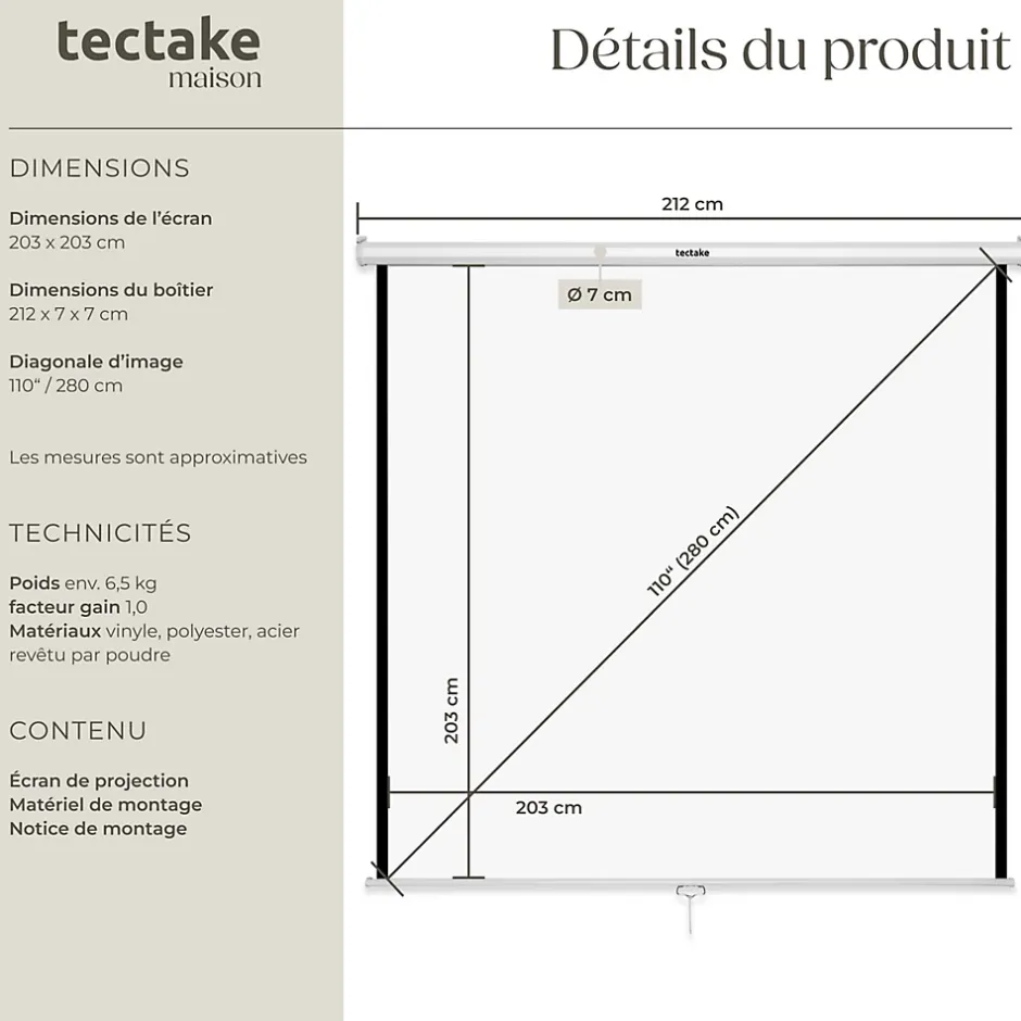 - Caractéristiques techniques:Dimensions de la toile (Lxl) : environ 203 cm x 203 cm. Diagonale de l’image : environ 110″ / 280 cm. Dimensions du carter (boîtier) (LxPxH) : environ 212 cm x 7 cm x 7 cm. Facteur de gain : 1,0. Matériau : Vinyle. / Métal. / Polyester. Poids : 6,3 kg.