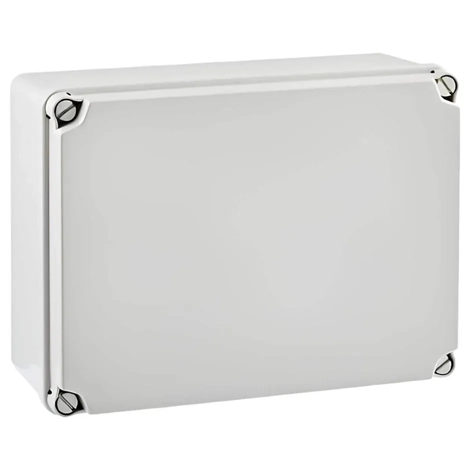 Boite Étanche – 180x241x95mm – IP67Cette boite étanche à couvercle opaque est fabriquée par IDE.Cette boite dispose d’une étanchéité IP67 ainsi qu’une résistance aux impacts externes IK07.Résistante aux UV, cette boite peut être installée en extérieur.Les entrées de câbles de la gamme light se situent sur les faces latérales de la boite. Ce boitier ne dispose pas d’entrées prédécoupées, pensez à prévoir des presse-étoupes.Il est possible d’intégrer une plaque de montage et/ou rail DIN dans ce boitier étanche, permettant l’installation d’appareillage (disjoncteurs, relais, bloc de jonction…)Dimensions (HxLxP) : 180x241x95mmRéférence Plaque de montage compatible compatible : 92125; 92124Référence rail DIN compatible : 92721; 92722Matière : plastique sans halogèneTenue au fil incandescent : 650°CTempérature d’utilisation : -25°C à +40°C