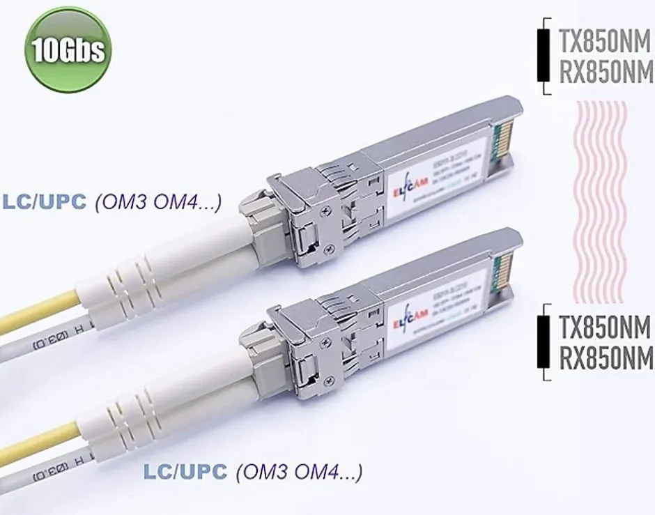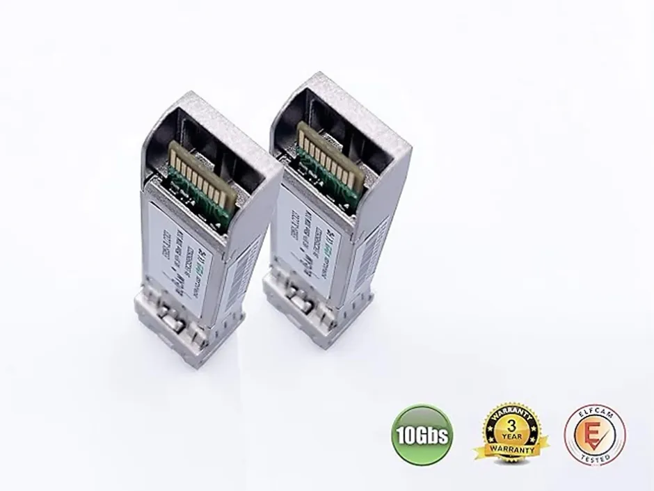 Description généraleLe pack de 2 modules SFP+ 10G multimode Elfcam est idéal pour les réseaux à haut débit internes à courte distance. Conçus pour les fibres OM3/OM4, ils offrent une transmission stable jusqu’à 300 m à 850 nm via connecteurs LC/UPC duplex. Ils sont compatibles avec Freebox Ultra, switches Cisco, Huawei, Ubiquiti, etc.Spécifications techniques Type : SFP+ 10G SR multimode Connecteurs : LC/UPC duplex Longueur d’onde : 850 nm Distance : 300 m (OM3), 400 m (OM4) Format : SFP+ hot-swappable, conforme MSA Catégorie : Ethernet 10G / Cat 6a Garantie : 5 ans – Support client France 24/7Compatibilité et applications Compatibilité : Freebox Ultra, Cisco SFP-10G-SR, Ubiquiti UF-MM-10G, Huawei, Netgear, Juniper, TP-Link, Mikrotik Applications : tiroirs optiques, panneaux FAP, capteurs, réseaux d’entreprise, fibre courte portée 10GbpsInstallationInsérez les modules dans un port SFP+ compatible. Fonctionne immédiatement sans configuration. Idéal pour les liaisons fibre OM3 dans les armoires réseau, racks ou datacenters.UtilisationConçu pour la connectivité 10G fiable à courte portée, ce module répond aux besoins des opérateurs, entreprises, et intégrateurs de réseaux performants.Autres informationsMatériaux de qualité avec dissipateur thermique intégré. Produits testés unitairement. Fournis en lot double pour une liaison bidirectionnelle fibre OM3.Images du produit