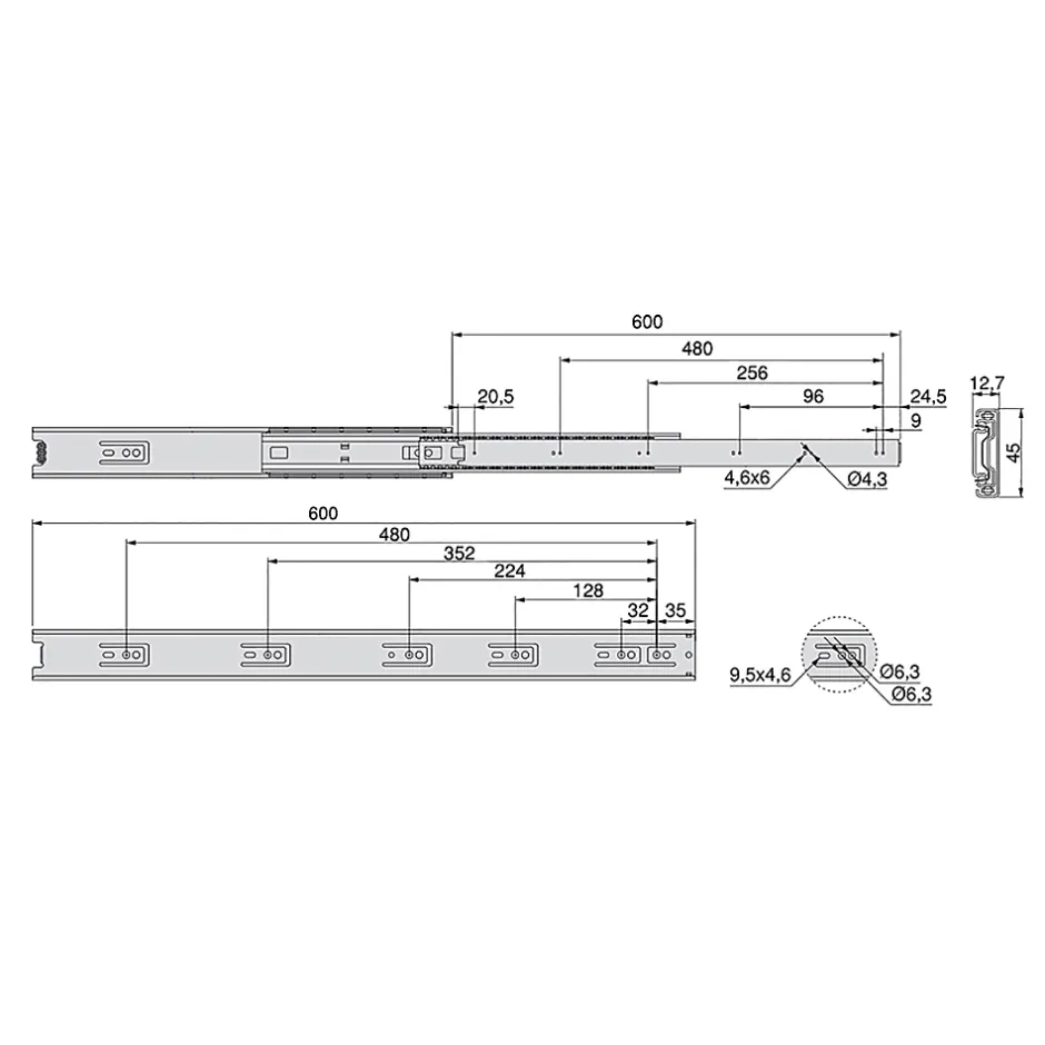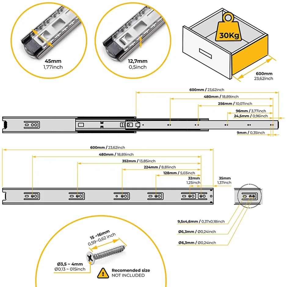 Coulisses avec roulements à billes et sortie totale du tiroir.Fabriquées en acier zingué.Hauteur 45 mm.Longueur 600 mm.Charge maximum par jeu 30 kg.Fournies par jeux complets.Gâchette pour le démontage de la coulisse. VOIR LES MESURES DU PRODUIT DANS LES IMAGES. Coulisses à billes à sortie totale fabriquées en acier zingué. Guide de hauteur 45mm. Les vis de montage ne sont pas incluses. Avec gâchette pour le démontage. Charge maximum 30kg.