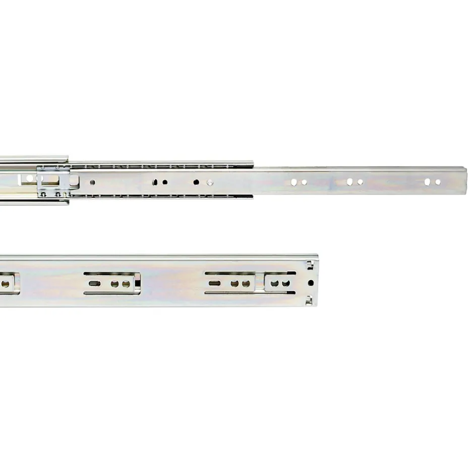 Coulisses à billes à sortie totale fabriquées en acier zingué. Guide de hauteur 45 mm. Les vis de montage ne sont pas incluses. Avec gâchette pour le démontage. Charge maximum 30 kg. Fournies par jeu complet gauche et droite. Gâchette pour le démontage de la coulisse.