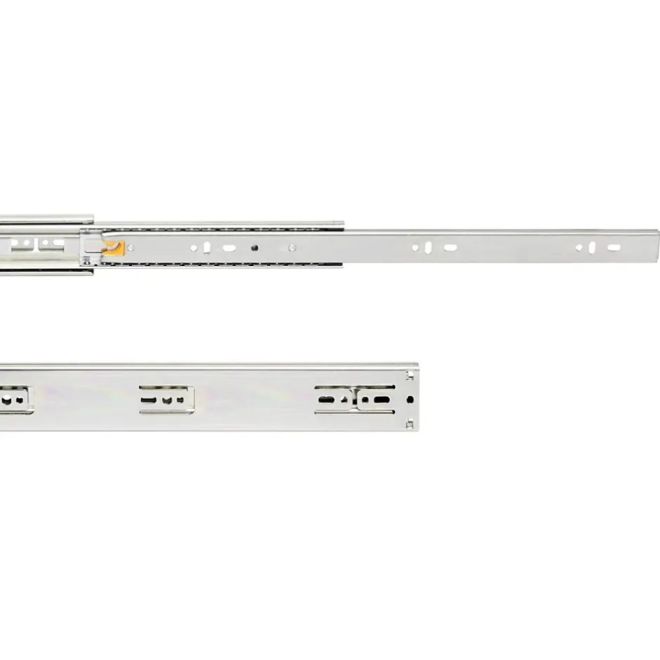 Coulisses à sortie totale pour tiroirs à fermeture amortie avec rouleaux à billes de haute qualité assurant un glissement doux et silencieux. Supporte jusqu’à 35 kg. Montage facile avec vis et démontage par gâchette. Conçu pour meubles nécessitant un accès total aux tiroirs.