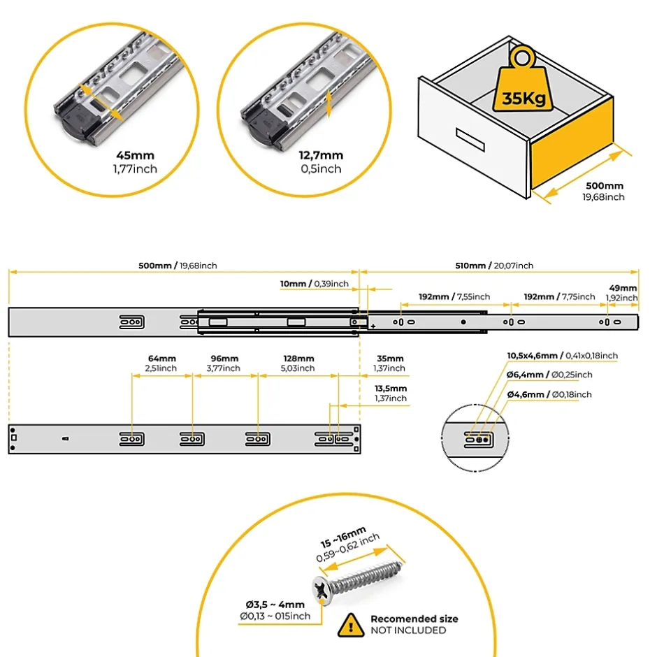 Coulisses à roulements à billes et sortie totale du tiroir.Fabriquées en acier zingué.Hauteur 45 mm.Longueur 500 mm.Charge maximum par jeu 35 kg.Vendues par paire.Avec piston amortisseur sur les deux coulisses pour une fermeture en douceur du tiroir.Avec gâchette pour le démontage de la coulisse. VOIR LES MESURES DU PRODUIT DANS LES IMAGES. Coulisses à sortie totale pour tiroirs à fermeture amortie, dont les billes de haute qualité permettent un glissement doux et silencieux. Elles sont dôtées également d’une grande capacité de charge, pouvant supporter jusqu’à 35 kg par tiroir. Montage au moyen de vis et démontage avec la gâchette située sur la coulisse-même.