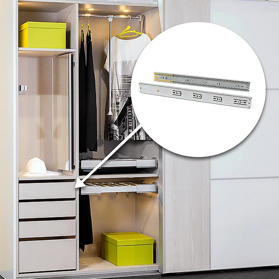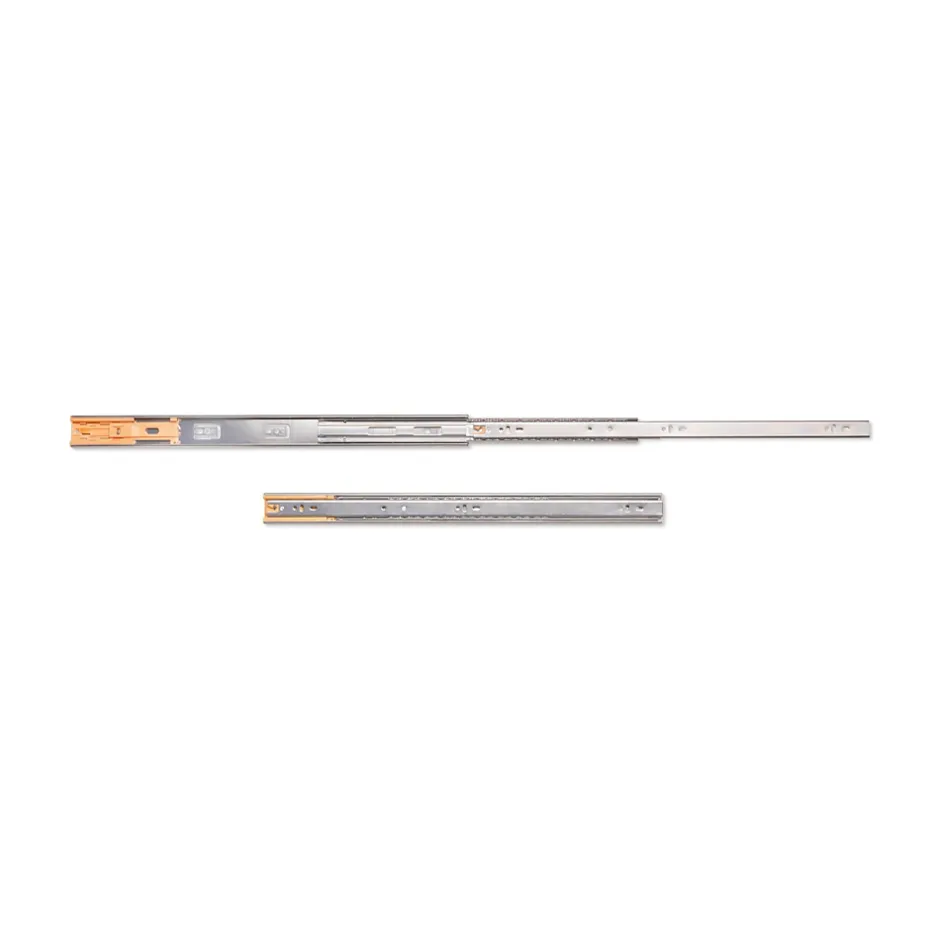 Coulisses à sortie totale pour tiroirs à fermeture amortie, dont les billes de haute qualité permettent un glissement doux et silencieux. Capacité jusqu’à 35 kg par tiroir. Montage avec vis fournies et démontage avec gâchette intégrée. Acier zingué pour résistance et durabilité.