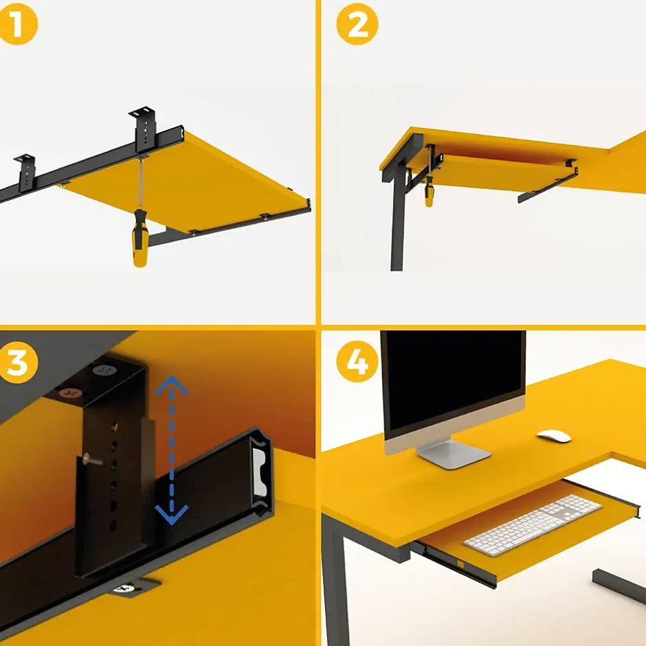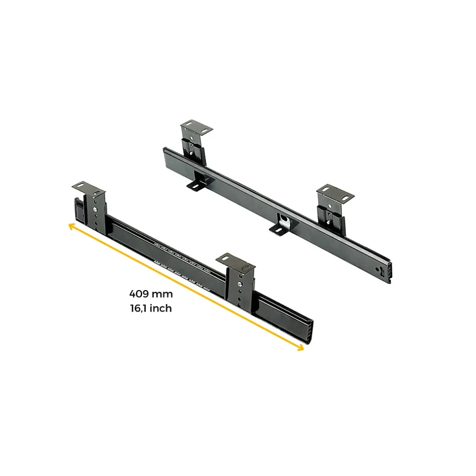 Coulisses porte-clavier pour supports de clavier, conçues pour un usage intensif sur les bureaux ou le mobilier technique.Hauteur réglable sur 6 positions, pour adapter le plateau du clavier à une position ergonomique en fonction des besoins de l’utilisateur.Montage sous le bureau, avec des languettes qui peuvent être orientées vers l’intérieur ou vers l’extérieur pour s’adapter à l’espace disponible sous la table.Recommandées pour les panneaux d’une épaisseur minimale de 16 mm et d’une largeur comprise entre 450 et 600 mm (non inclus). L’utilisation de vis à bois de 4×12 mm est recommandée.Fabriquées en acier avec une finition zingué noir, elles supportent jusqu’à 20 kg de charge et garantissent résistance et durabilité. VOIR LES MESURES DU PRODUIT DANS LES IMAGES. Coulisses à billes porte-clavier avec réglage en hauteur. Spécialement conçues pour les meubles de bureau et les tables de travail.