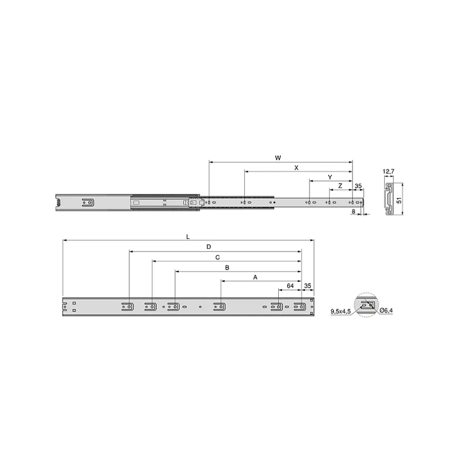 Coulisses avec roulements pour tiroir de grande charge à billes et sortie totale du tiroir.Fabriquées en acier zingué.Hauteur 51 mm et longueur 400 mm.Charge maximum par jeu 68 kg.Chaque lot contient 4 paires de coulisses emballées individuellement.Gâchette pour le démontage de la coulisse. VOIR LES MESURES DU PRODUIT DANS LES IMAGES. Coulisses à sortie totale pour tiroirs, dont les billes de haute qualité permettent un glissement doux et silencieux. Elles sont dôtées également d’une grande capacité de charge, pouvant supporter jusqu’à 68 kg par tiroir.Montage au moyen de vis et démontage avec la gâchette située sur la coulisse-même.