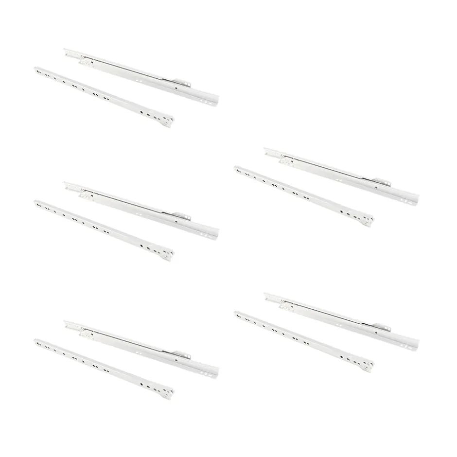 Coulisses à roulettes à sortie partielle et fermeture avec chute. Longueur de la coulisse L 400 mm. Capacité de charge maximum 20 kg. Possibilité de montage avec Eurovis tête plate avec pré-perçage de D. 5 mm. Fabriquées en acier peint blanc RAL 9001. Chaque lot contient 5 paires de coulisses emballées individuellement. Fermeture amortie disponible (non incluse). VOIR LES MESURES DU PRODUIT DANS LES IMAGES. Les coulisses de roulettes T30 sont conçues pour garantir un glissement fluide et fiable dans tous les types d’applications de mobilier. Elles offrent un coulissant partiel avec fermeture par gravité et sont disponibles en différentes longueurs et finitions, ce qui permet de les adapter facilement à différents formats de tiroirs.Fabriquées en acier résistant, elles supportent une charge maximale de 20 kg et sont compatibles avec des panneaux de 12 à 12,5 mm d’épaisseur. Elles s’installent à l’aide d’une vis Euro à tête plate, avec un pré-perçage de 5 mm.De plus, elles peuvent être montées avec un système de fermeture amortie (non inclus), qui améliore encore davantage l’expérience d’utilisation.