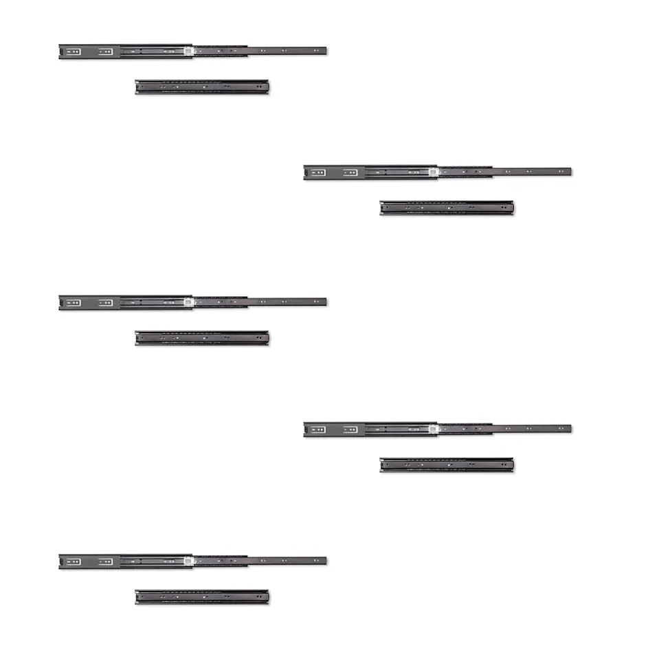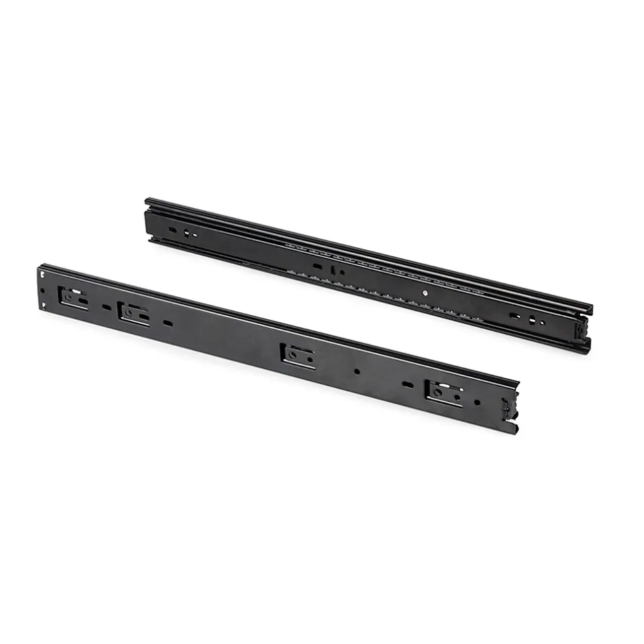 Coulisses avec roulements à billes et sortie totale du tiroir.Fabriquées en acier peint en noir.Hauteur 45 mm.Longueur 400 mm.Charge maximum par jeu 30 kg.Fournies par jeux complets.Gâchette pour le démontage de la coulisse. VOIR LES MESURES DU PRODUIT DANS LES IMAGES. Coulisses à billes à sortie totale fabriquées en acier zingué. Guide de hauteur 45mm. Les vis de montage ne sont pas incluses. Avec gâchette pour le démontage. Charge maximum 30kg.