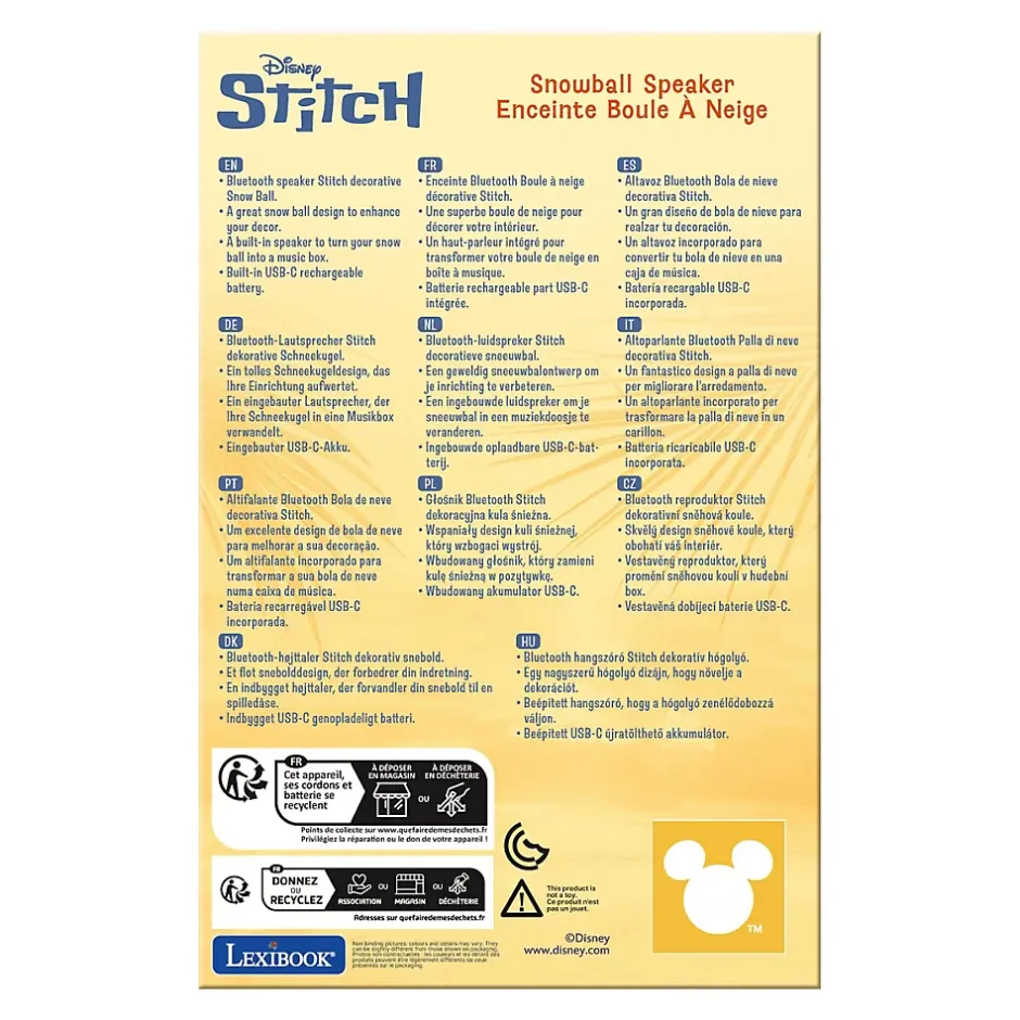 Enceinte Bluetooth Boule à neige décorative StitchUne superbe boule de neige pour décorer votre intérieurUn haut-parleur intégré pour transformer votre boule de neige en boîte à musiqueBatterie rechargeable part USB-C intégrée