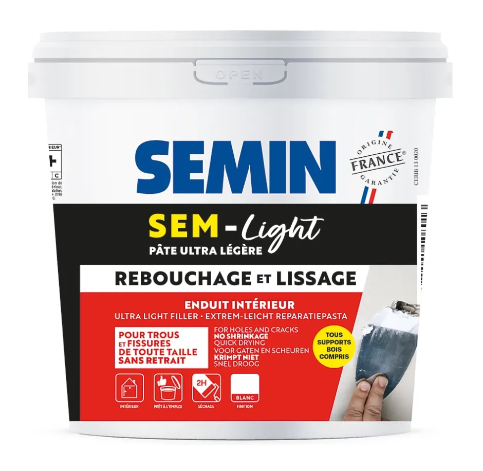 Prêt à l’emploi et allégé, Sem-Light 5 L rend les travaux de rebouchage et de lissage aisés, permet un recouvrement accéléré et de gagner du temps sur chantier.Sem-Light permet de réaliser des rebouchages et lissages de grande qualité avec une grande facilité d’utilisation.AVANTAGES• Pâte très légère• Séchage rapide• Finition blanc mat• Enduit souple• Application sur tous supports• Aucun retrait• Permet le jointement entre les plaques de plâtre et la menuiserie boisCOMPOSITION ET ASPECTLa pâte obtenue est de couleur blanc neige.CONDITIONNEMENTSeau de 5 L.CONSOMMATIONEnviron 0,4 kg/m² /mm d’épaisseur.APPLICATIONL’application se fait au couteau à enduire ou au couteau à mastic (couteau plus fin que le couteau à enduire).