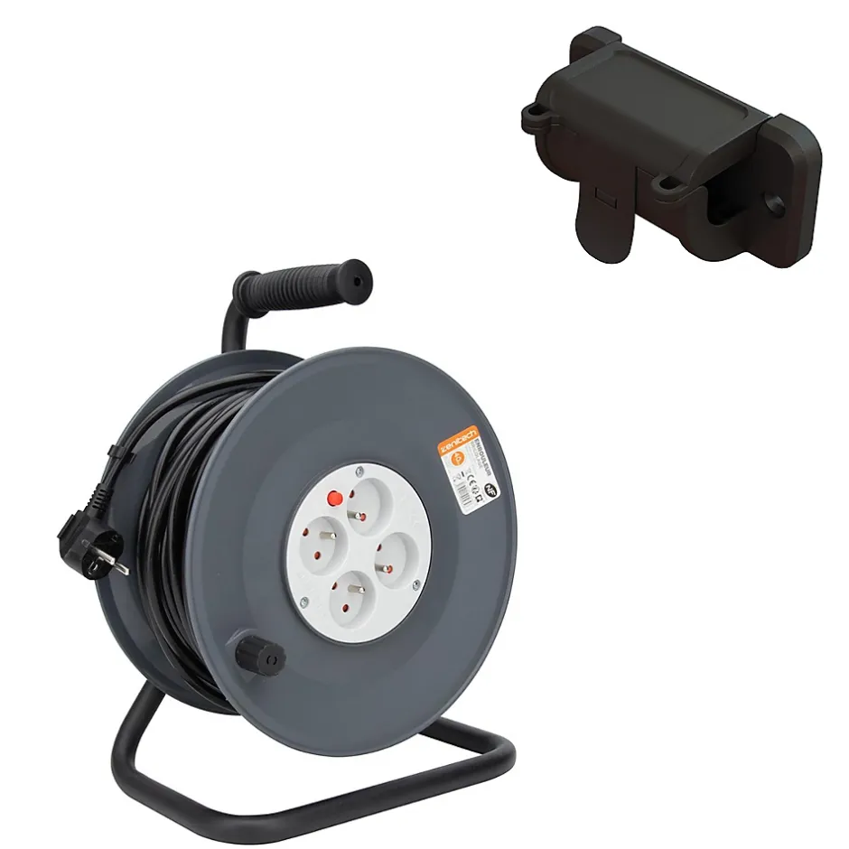 Caractéristiques de l’enrouleur H05VV-F 4 prises 25m 3G1,5 + coupe-circuit + support mural – Zenitech :Modèle : enrouleur 4 prisesCouleur(s) : noirCâblé en H05VV-F 3G1,5mm²Longueur : 25mPuissance max déroulé 3200W et enroulé 1100W sous 230VEnrouleur 4 prisesSécurité thermiqueNorme(s) : NFEnrouleur de bricolage 4 prises 2P+T 25m équipé d’une poignée ergonomique pour plus de confort et d’une peinture protectrice !Le socle est en métal pour une meilleur solidité. De plus, il est équipé d’un coupe-circuit de sécurité thermique. L’enrouleur 4 prises de couleur noire est conçu pour répondre à vos besoins électriques avec plusieurs longueurs de câble disponibles : 15, 25, 40 ou 50 mètres, offrant une flexibilité d’utilisation sur de grandes distances.Avec une puissance maximale de 3200W déroulé et 1100W enroulé sous 230V, il permet d’alimenter en toute sécurité des équipements variés. Les 4 prises 2P+T sont protégées par un système de sécurité thermique contre les surcharges et surchauffes.Conforme aux normes NF, cet enrouleur garantit une utilisation fiable et sécurisée, que ce soit pour des travaux domestiques ou professionnels.Support mural pour enrouleur de jardin entraxe 80mm – Zenitech :Modèle : support mural pour enrouleur de jardinCouleur(s) : noirFixation : muraleEntraxe 80mmDouble système de verrouillage centralCoupe circuit thermique 16ADesign ultra compactPoignée et guide câbles pour un enroulement facileSupport mural pour enrouleur de jardin de ZenitechIl s’installe facilement en trois étapes. Il vous suffit de fixer le support au mur, de placer l’enrouleur dans le supp…